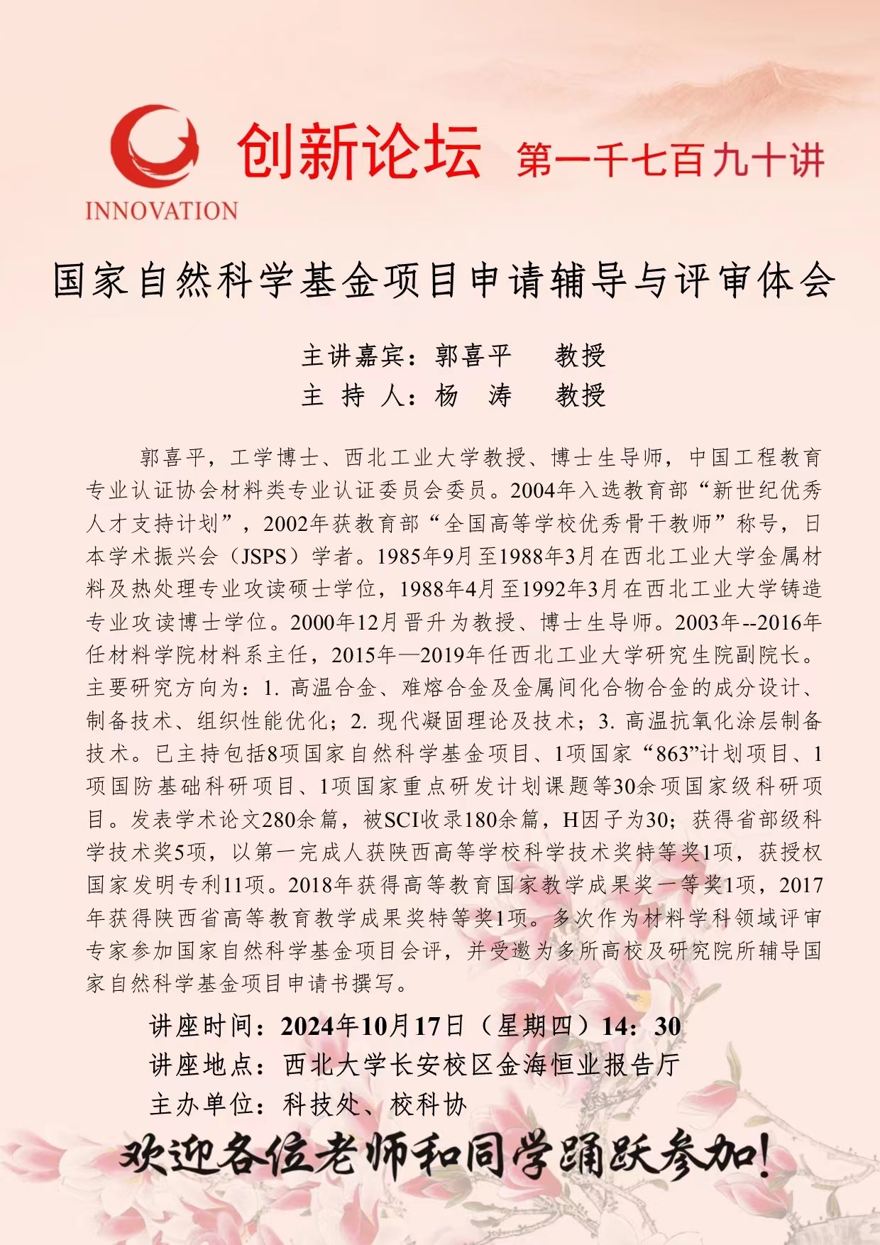 郭喜平 教授 乐投平台创新论坛第一千七百九十讲:国家自然科学基金项目申请辅导与评审体会 讲座时间 2024年10月17日(星期四)下午2:30 讲座地点 乐投平台长安校区金海恒业报告厅 讲座人介绍 郭喜平 教授 讲座内容