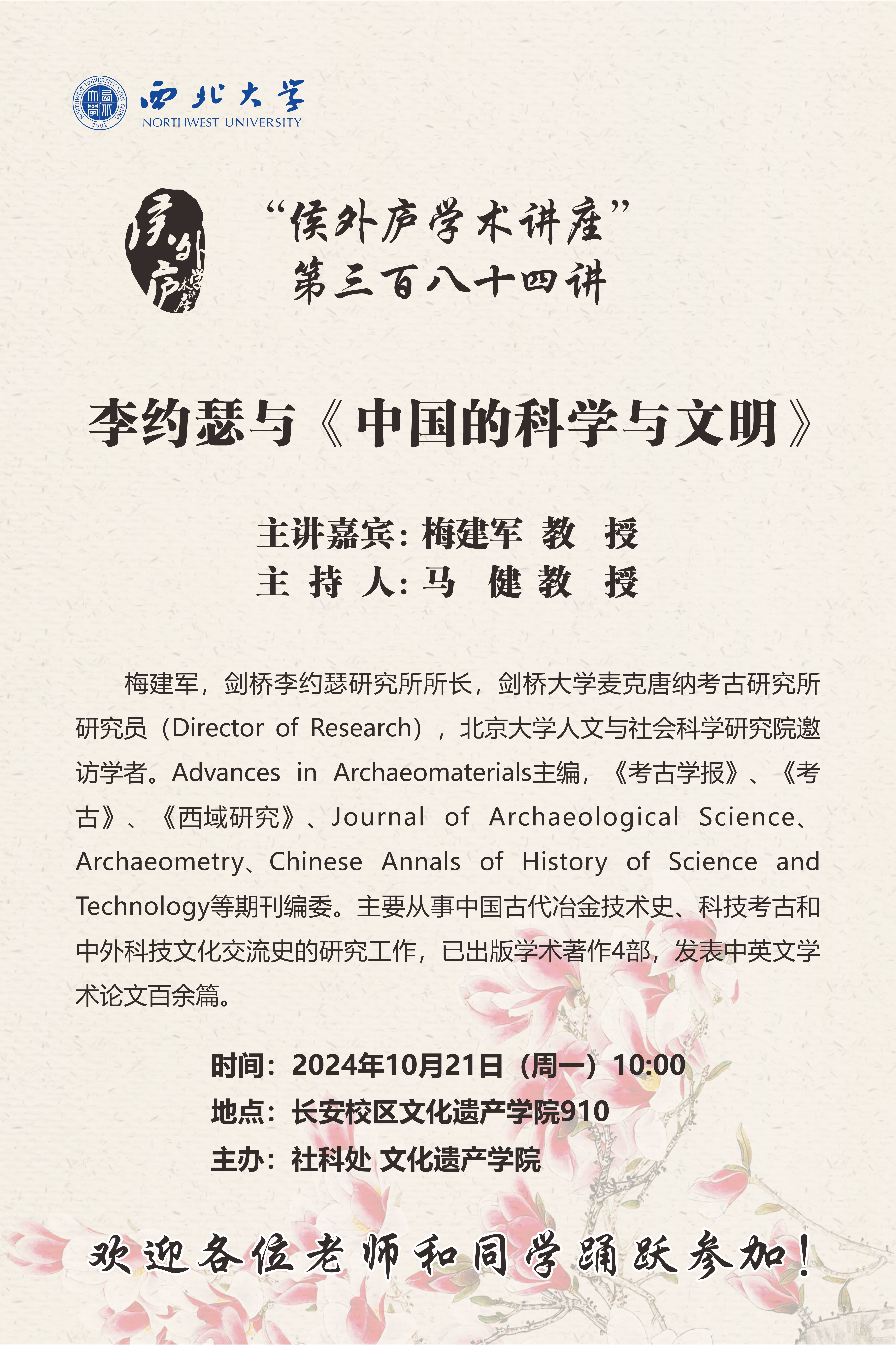 梅建军 教授 “侯外庐学术讲座”第三百八十四讲:李约瑟与《中国的科学与文明》 讲座时间 2024年10月21日(周一)10:00 讲座地点 长安校区文化遗产学院910 讲座人介绍 梅建军 教授 讲座内容