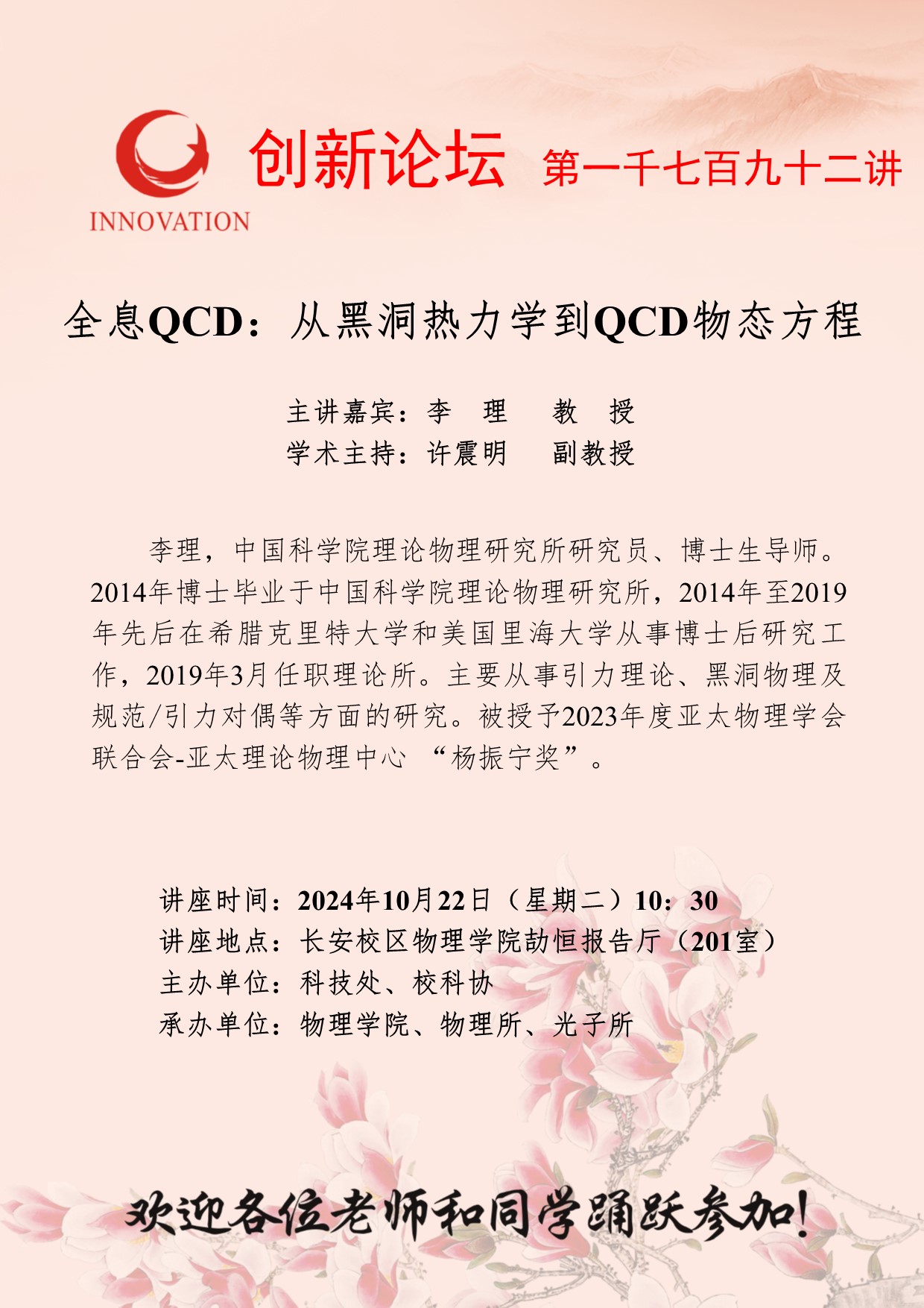 李理 教授 乐投平台创新论坛第一千七百九十二讲:全息QCD:从黑洞热力学到QCD物态方程 讲座时间 2024年10月22日(星期二)10:30 讲座地点 长安校区物理学院劼恒报告厅(201室) 讲座人介绍 李理 教授 讲座内容