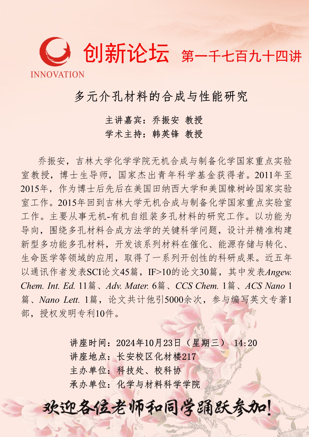 乔振安 教授 乐投平台创新论坛第一千七百九十四讲:多元介孔材料的合成与性能研究 讲座时间 2024年10月23日(星期三) 14:20 讲座地点 长安校区化材楼217 讲座人介绍 乔振安 教授 讲座内容