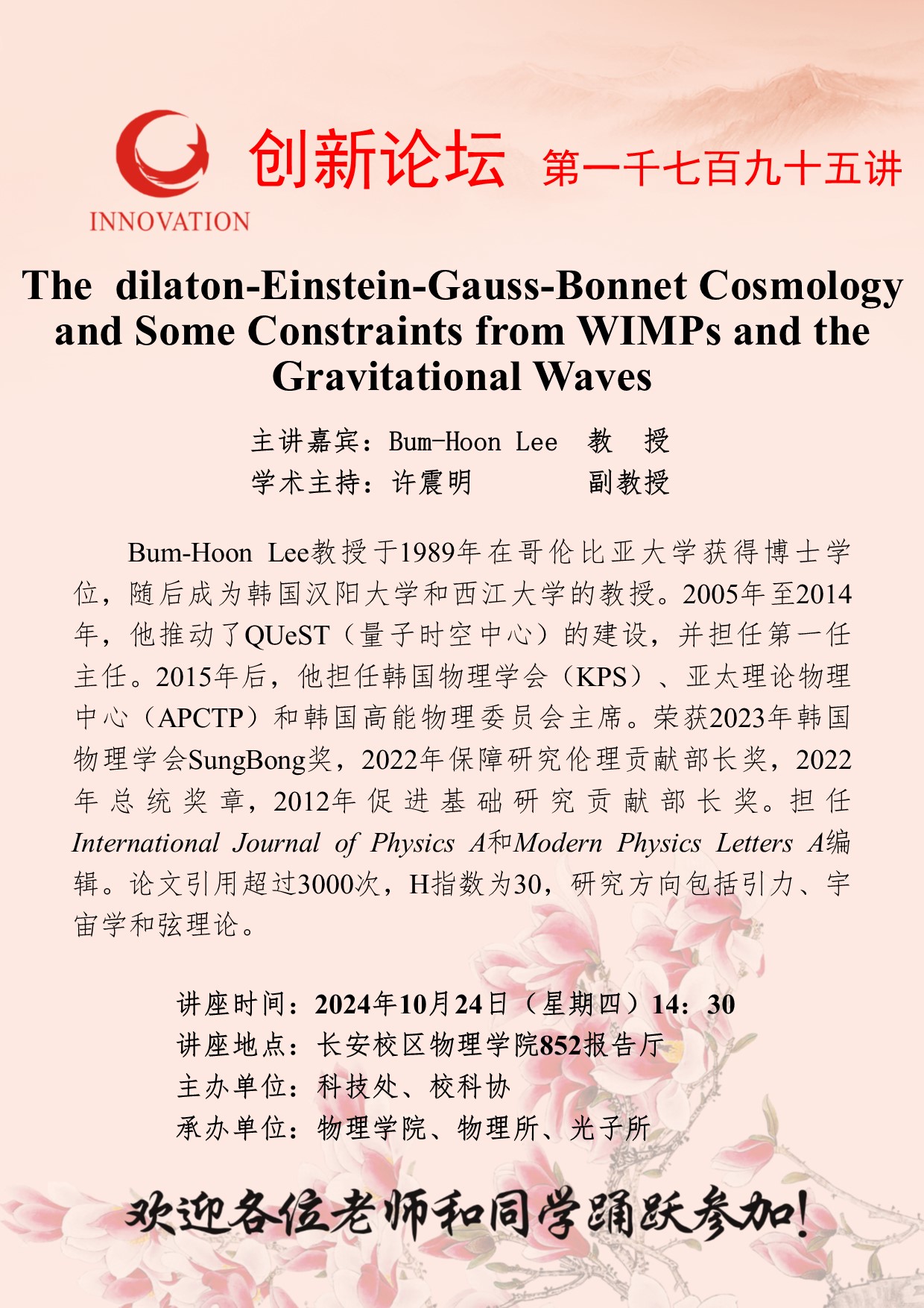 Bum-Hoon Lee 教授 乐投平台创新论坛第一千七百九十五讲:The dilaton-Einstein-Gauss-Bonnet Cosmology and Some Constraints from WIMPs and the Gravitational Waves 讲座时间 2024年10月24日(星期四)14:30 讲座地点 长安校区物理学院852报告厅 讲座人介绍 Bum-Hoon Lee 教授 讲座内容