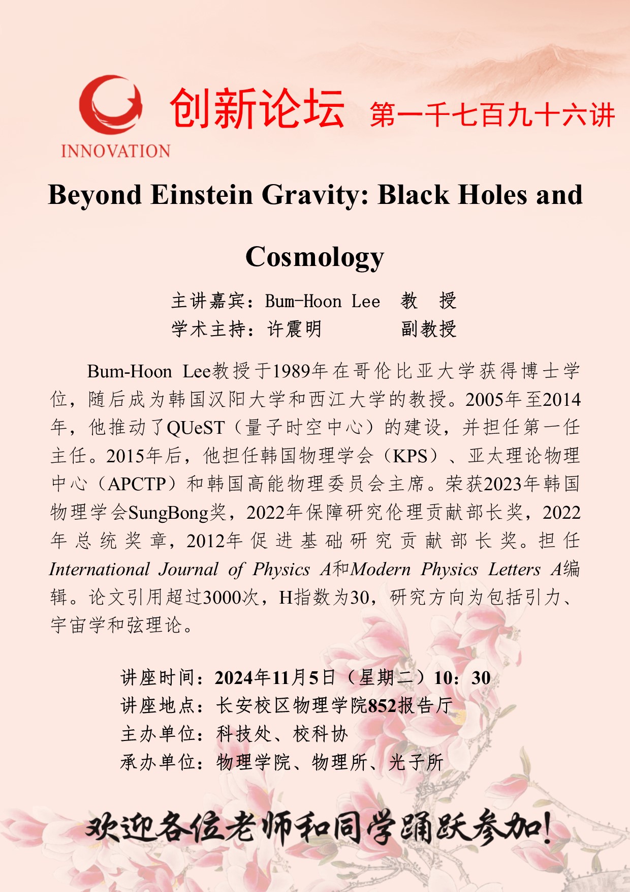 Bum-Hoon Lee 教授 乐投平台创新论坛第一千七百九十六讲:Beyond Einstein Gravity: Black Holes and Cosmology 讲座时间 2024年11月5日(星期二)10:30 讲座地点 长安校区物理学院852报告厅 讲座人介绍 Bum-Hoon Lee 教授 讲座内容