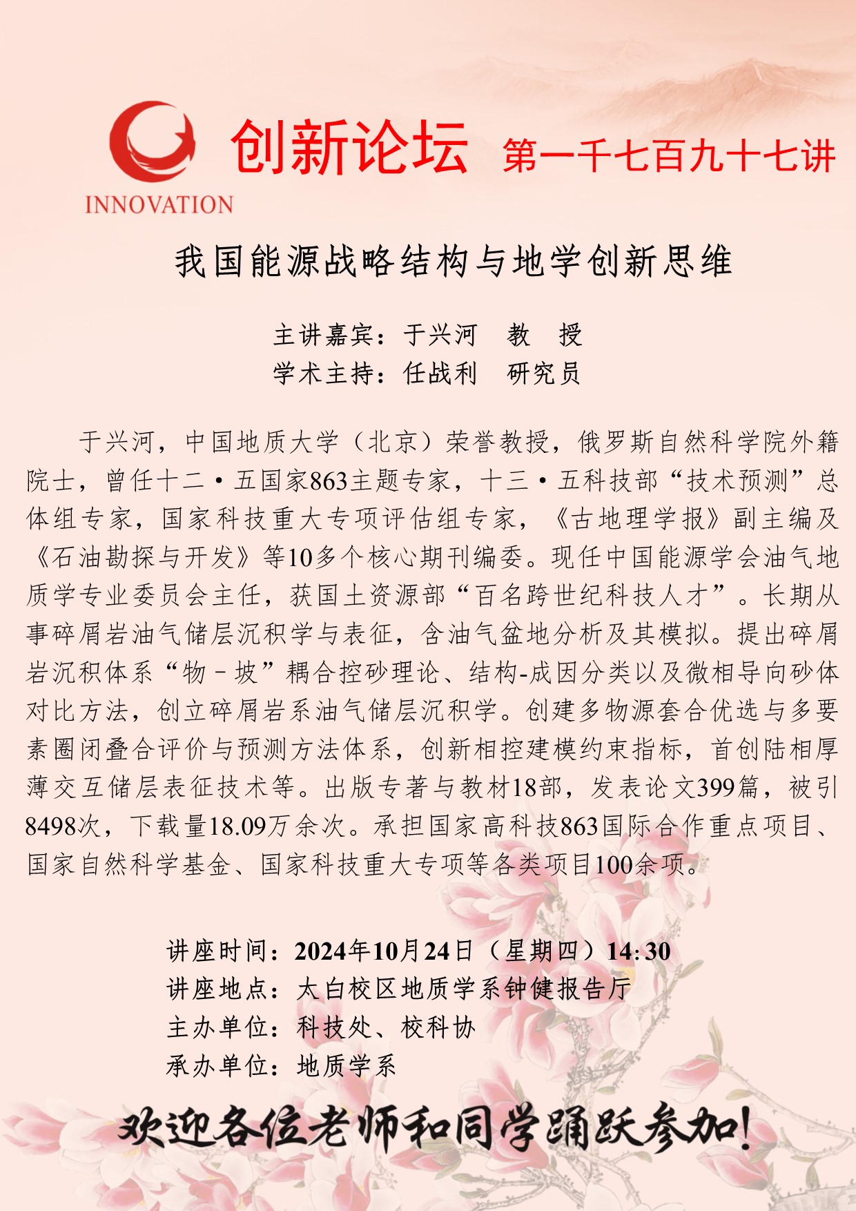 于兴河 教授 乐投平台创新论坛第一千七百九十七讲:我国能源战略结构与地学创新思维 讲座时间 2024年10月24日(星期四)14:30 讲座地点 太白校区地质学系钟健报告厅 讲座人介绍 于兴河 教授 讲座内容