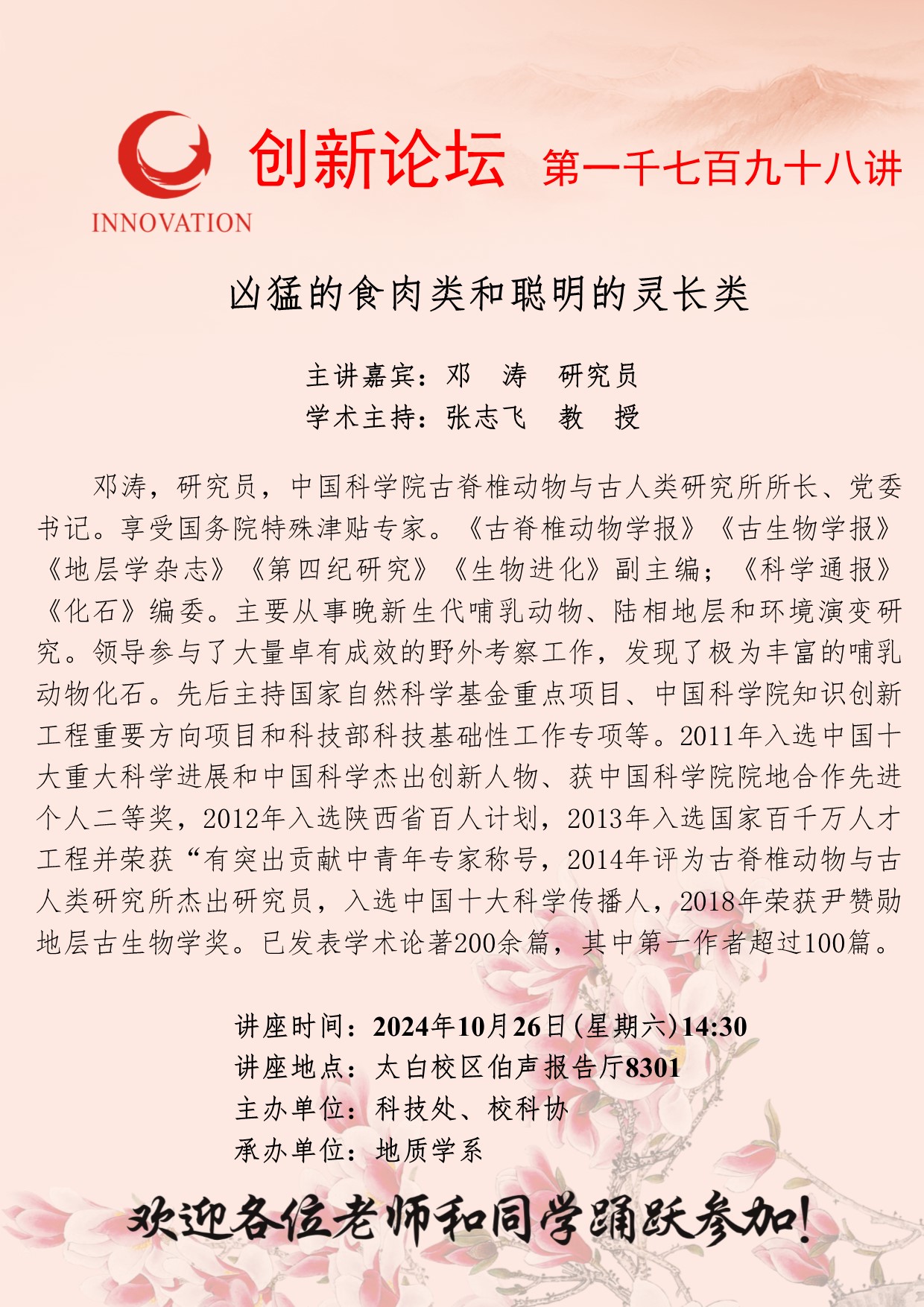 邓涛 研究员 乐投平台创新论坛第一千七百九十八讲:凶猛的食肉类和聪明的灵长类 讲座时间 2024年10月26日(星期六)14:30 讲座地点 太白校区伯声报告厅8301 讲座人介绍 邓涛 研究员 讲座内容
