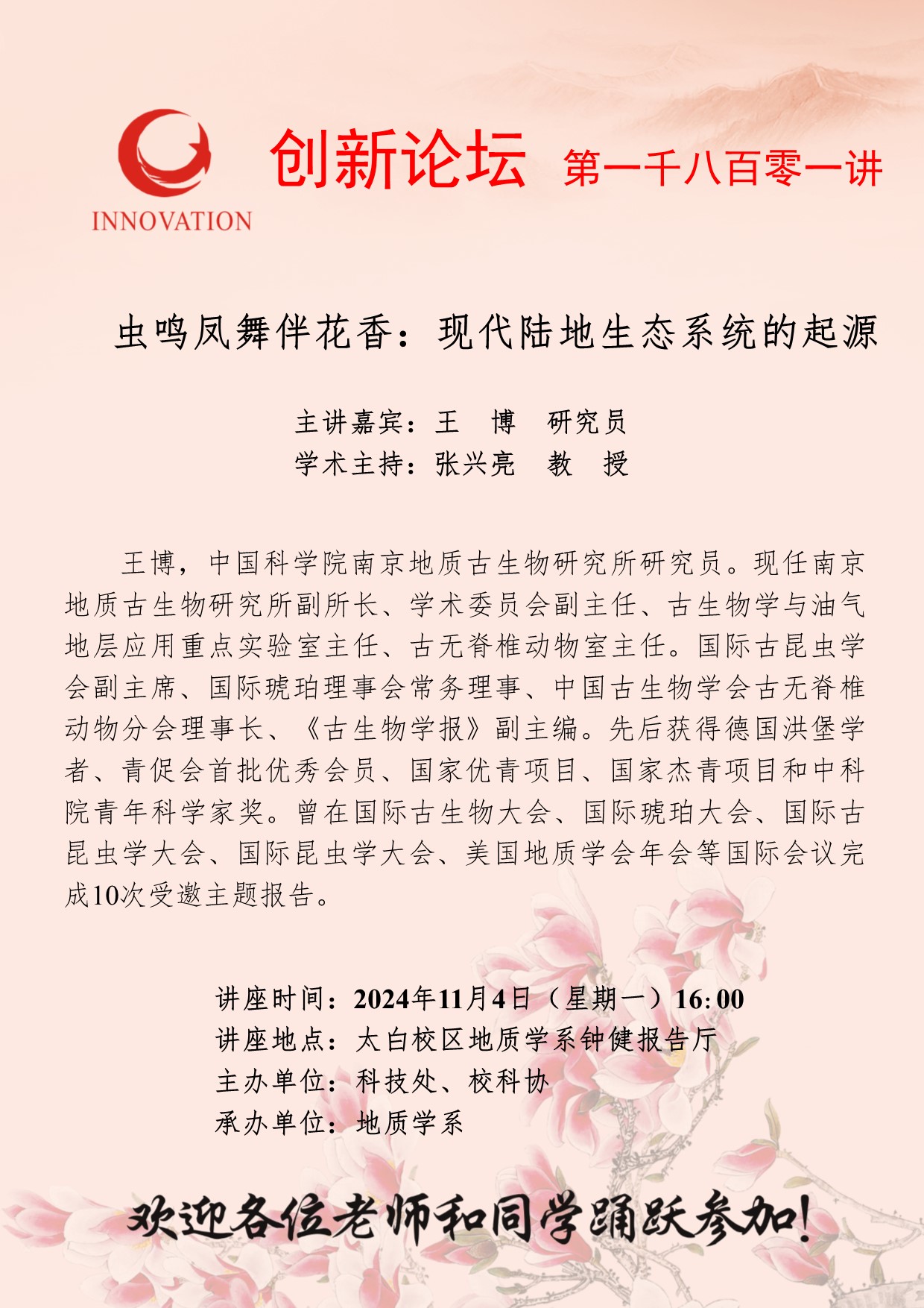 王 博 研究员 乐投平台创新论坛第一千八百零一讲:虫鸣凤舞伴花香:现代陆地生态系统的起源 讲座时间 2024年11月4日(星期一)16:00 讲座地点 太白校区地质学系钟健报告厅 讲座人介绍 王 博 研究员 讲座内容