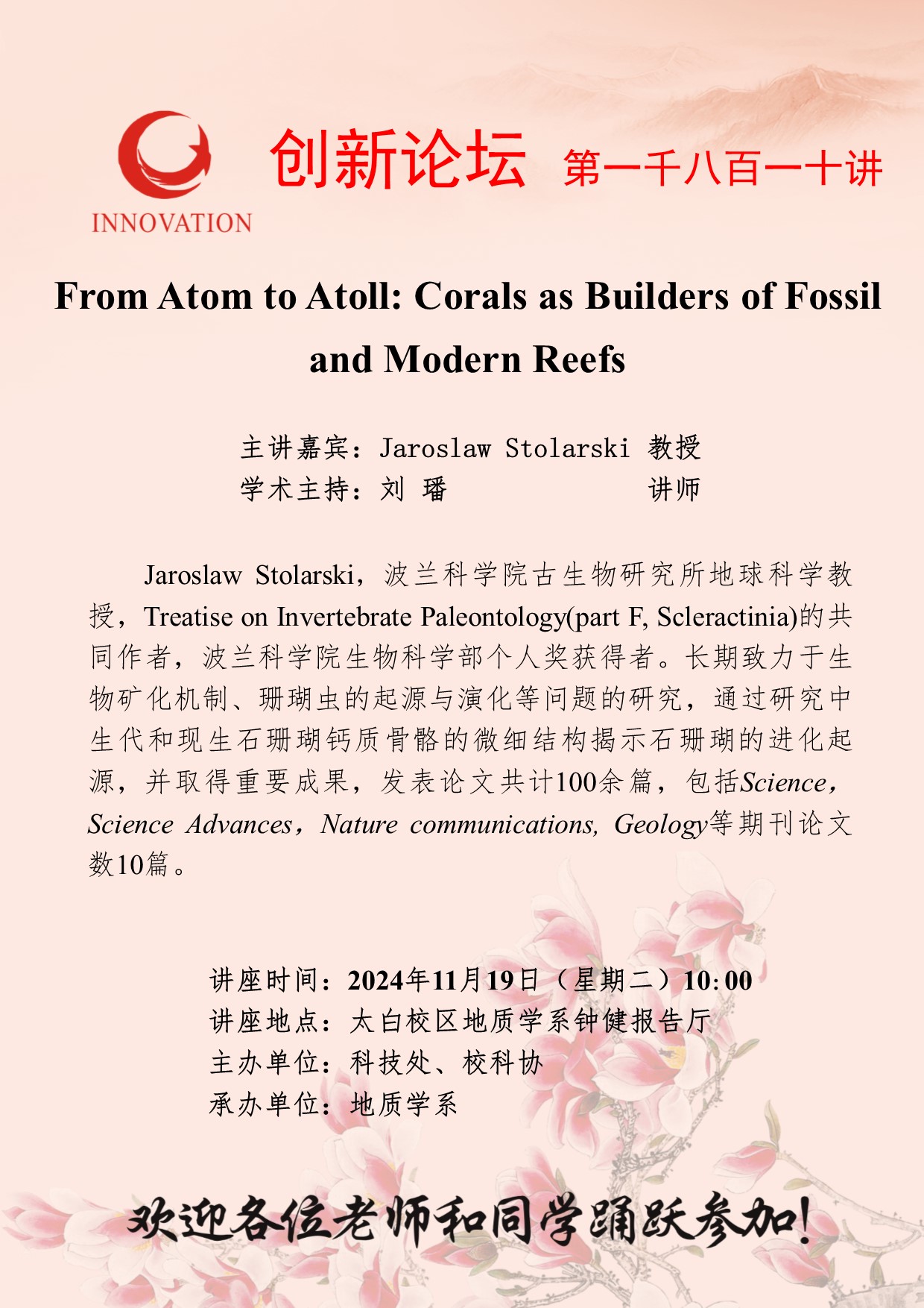 Jaroslaw Stolarski 教授 乐投平台创新论坛第一千八百一十讲:From Atom to Atoll: Corals as Builders of Fossil and Modern Reefs 讲座时间 2024年11月19日(星期二)10:00 讲座地点 太白校区地质学系钟健报告厅 讲座人介绍 Jaroslaw Stolarski 教授 讲座内容