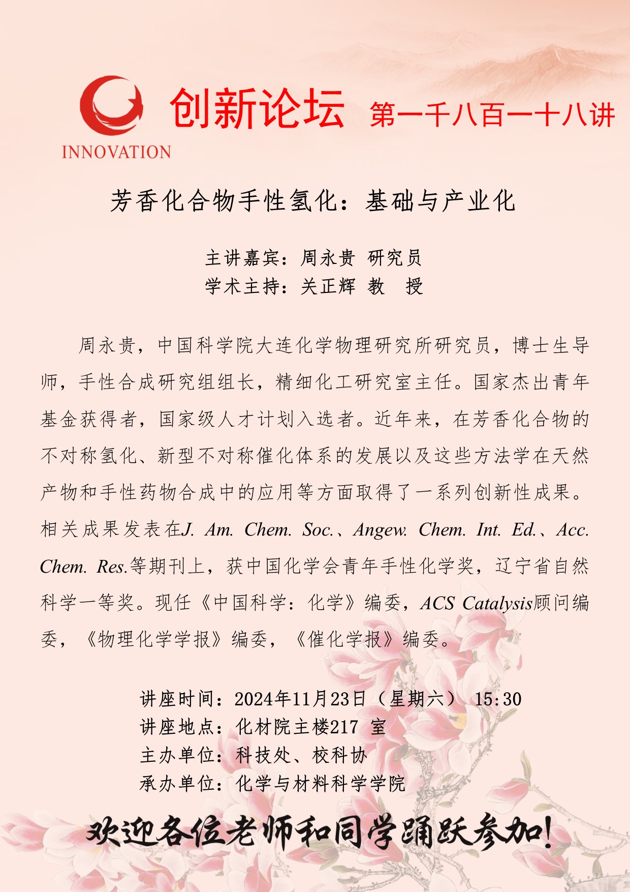 周永贵 研究员 乐投平台创新论坛第一千八百一十八讲:芳香化合物手性氢化:基础与产业化 讲座时间 2024年11月23日(星期六) 15:30 讲座地点 化材院主楼217 室 讲座人介绍 周永贵 研究员 讲座内容