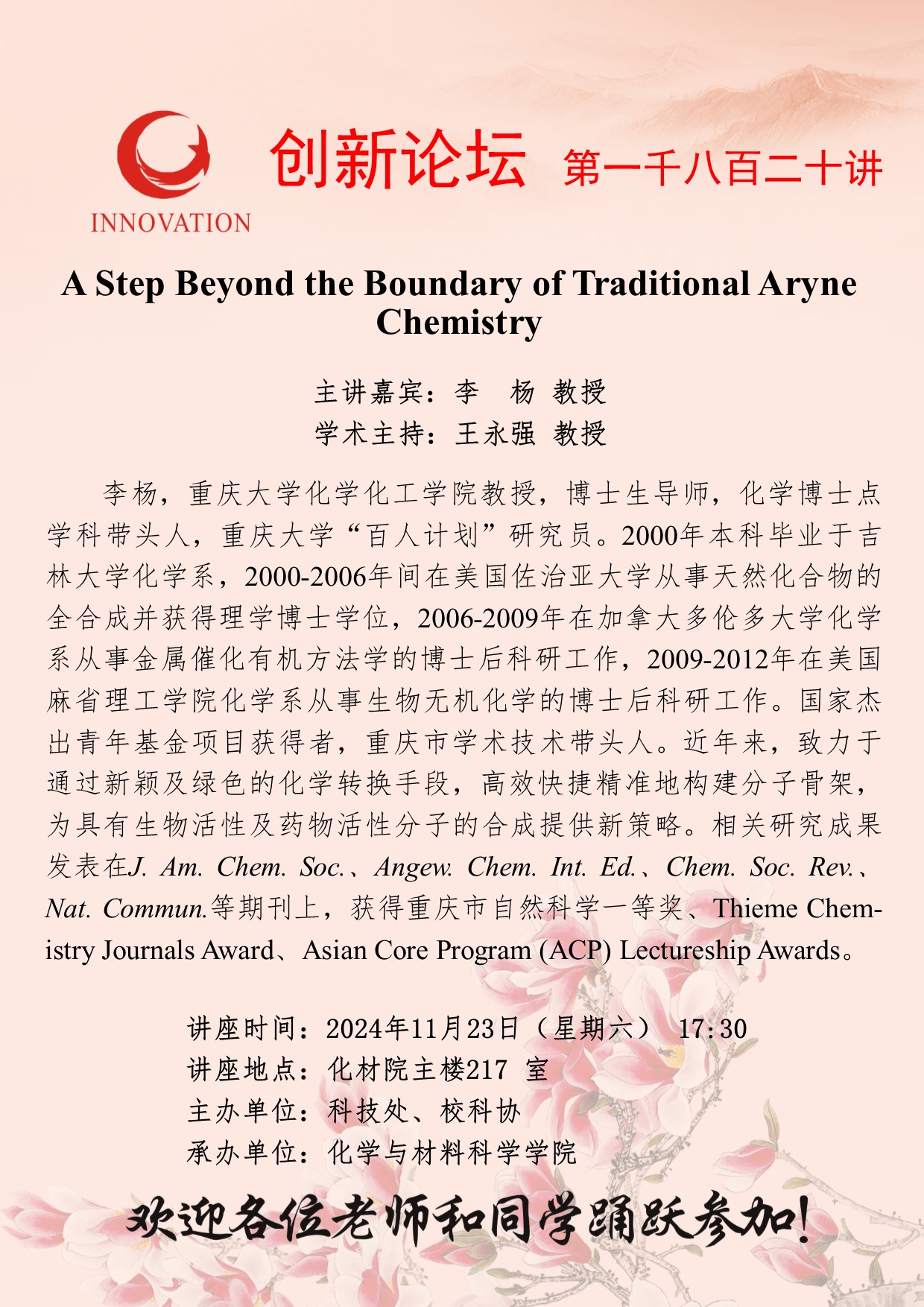 李杨 教授 乐投平台创新论坛第一千八百二十讲:A Step Beyond the Boundary of Traditional Aryne Chemistry 讲座时间 2024年11月23日(星期六) 17:30 讲座地点 化材院主楼217室 讲座人介绍 李杨 教授 讲座内容