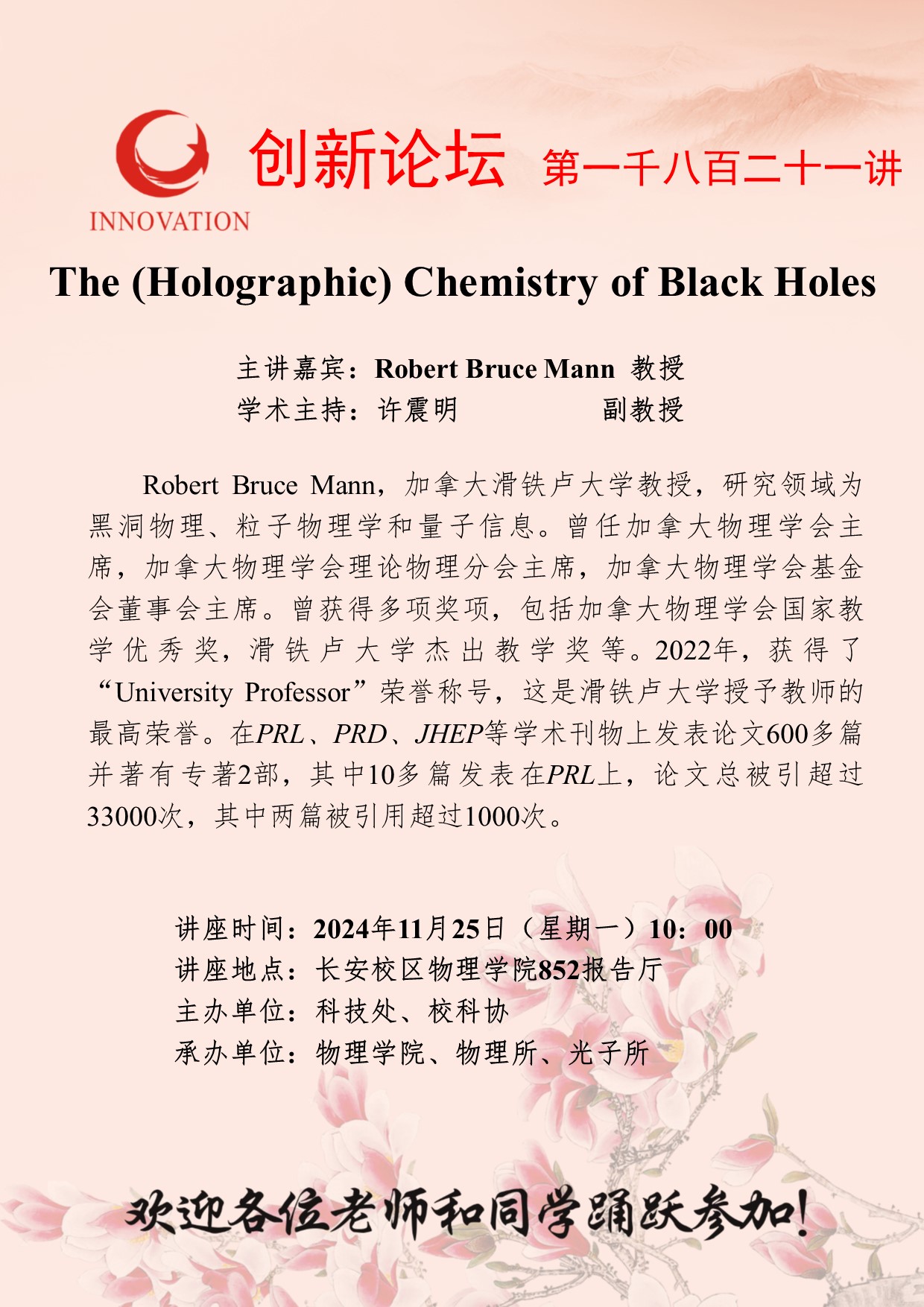 Robert Bruce Mann 教授 乐投平台创新论坛第一千八百二十一讲:The (Holographic) Chemistry of Black Holes 讲座时间 2024年11月25日(星期一)10:00 讲座地点 长安校区物理学院852报告厅 讲座人介绍 Robert Bruce Mann 教授 讲座内容