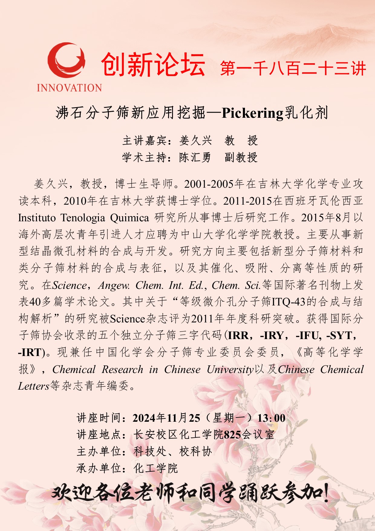 姜久兴 教授 乐投平台创新论坛第一千八百二十三讲:沸石分子筛新应用挖掘—Pickering乳化剂 讲座时间 2024年11月25(星期一)13:00 讲座地点 乐投平台长安校区化工学院825会议室 讲座人介绍 姜久兴 教授 讲座内容