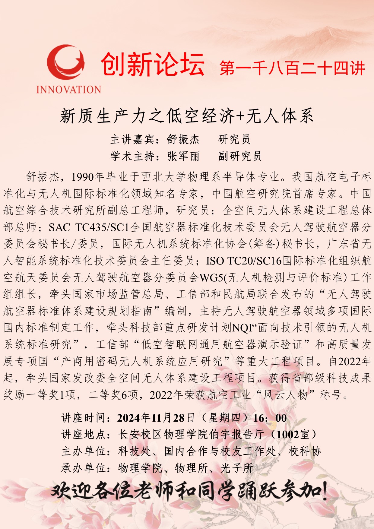 舒振杰 研究员 乐投平台创新论坛第一千八百二十四讲:新质生产力之低空经济+无人体系 讲座时间 2024年11月28日(星期四)16:00 讲座地点 长安校区物理学院伯宇报告厅(1002室) 讲座人介绍 舒振杰 研究员 讲座内容