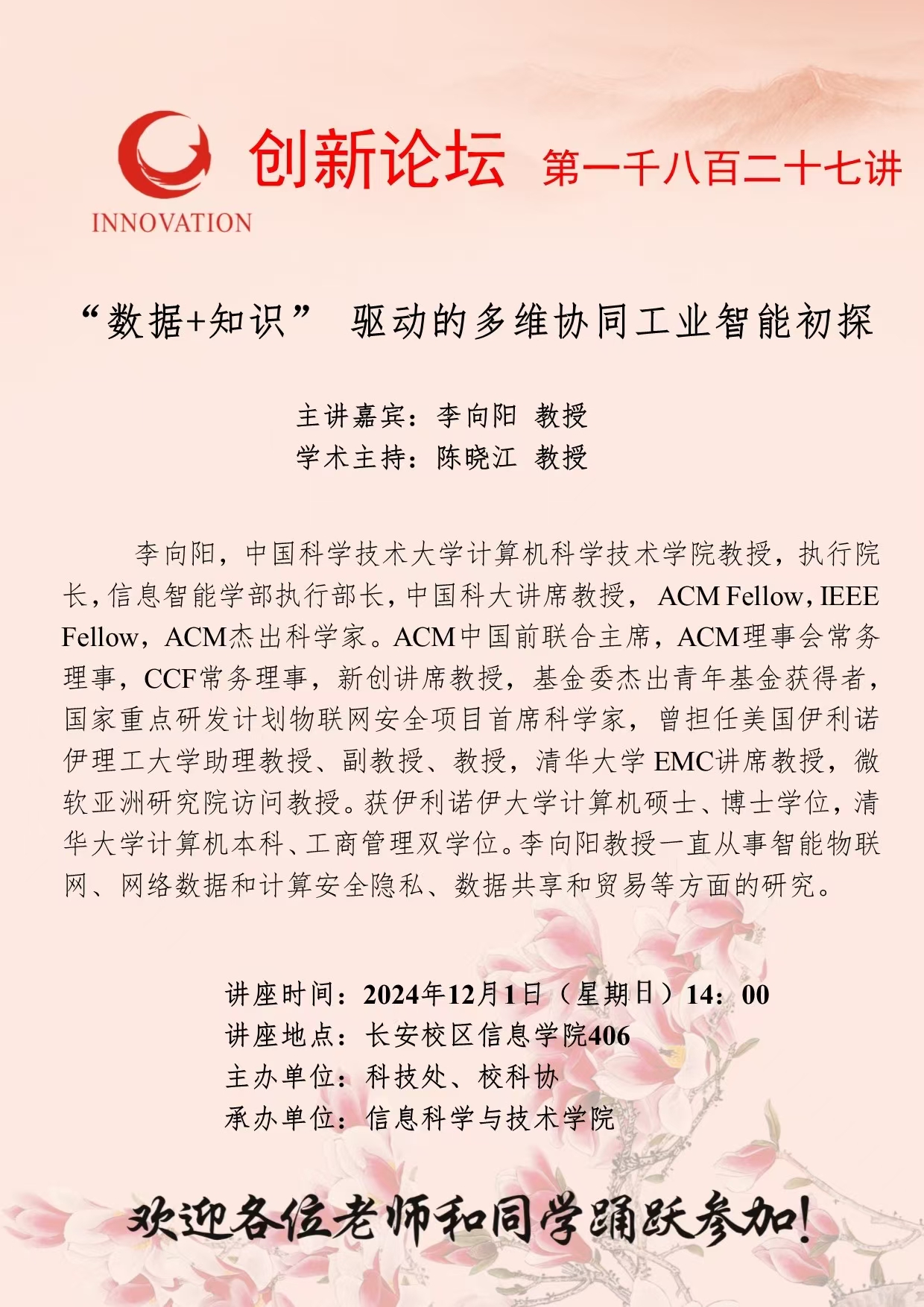 李向阳 教授 乐投平台创新论坛第一千八百二十七讲:“数据+知识” 驱动的多维协同工业智能初探 讲座时间 2024年12月1日(星期日)14:00 讲座地点 长安校区信息学院406 讲座人介绍 李向阳 教授 讲座内容