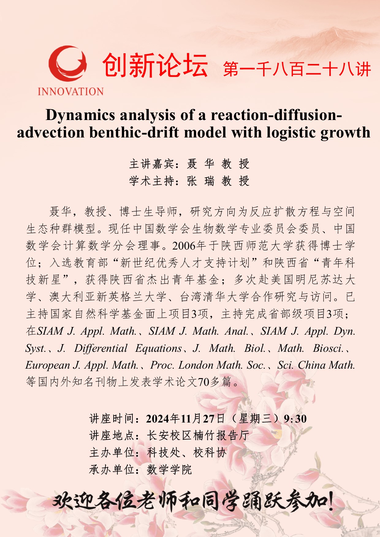 聂华 教授 乐投平台创新论坛第一千八百二十八讲:Dynamics analysis of a reaction-diffusion-advection benthic-drift model with logistic growth 讲座时间 2024年11月27日(星期三)9:30 讲座地点 长安校区楠竹报告厅 讲座人介绍 聂华 教授 讲座内容