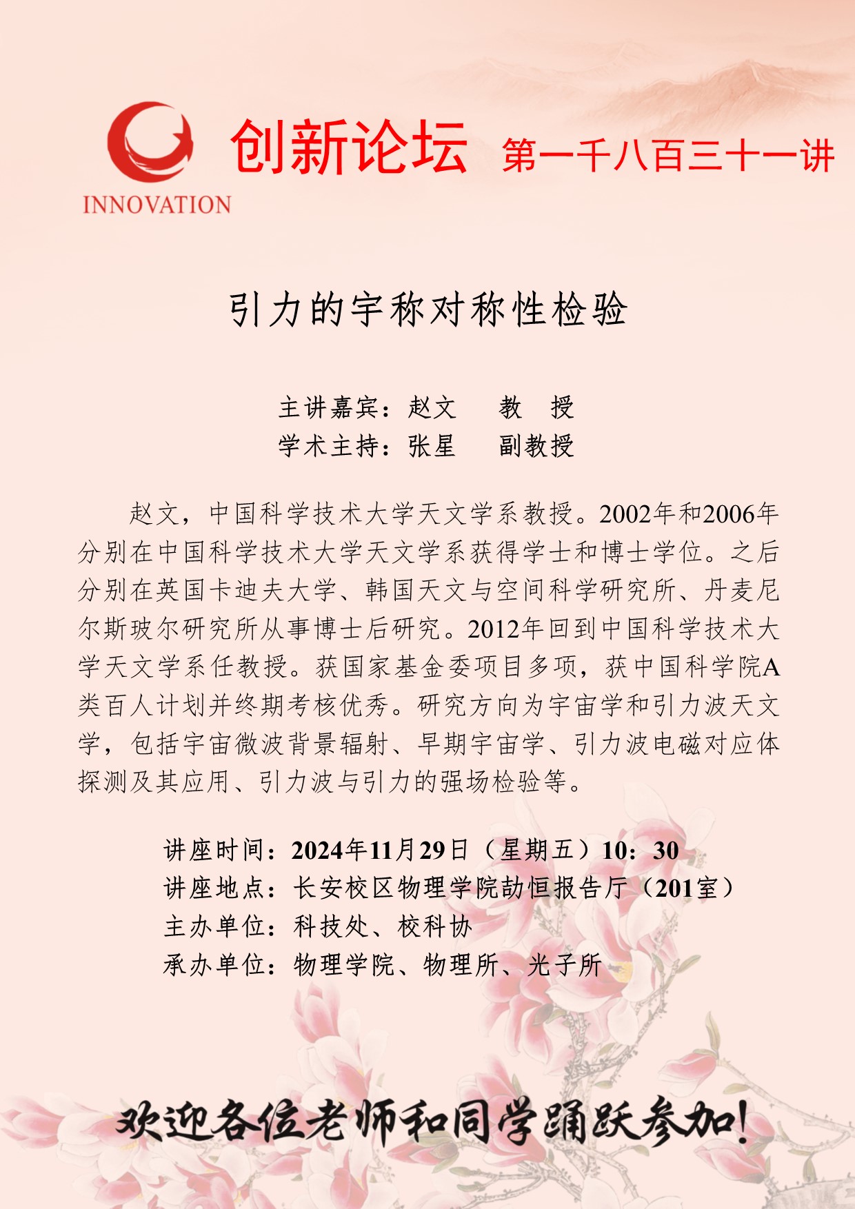 赵文 教授 乐投平台创新论坛第一千八百三十一讲:引力的宇称对称性检验 讲座时间 2024年11月29日(星期五)10:30 讲座地点 长安校区物理学院劼恒报告厅(201室) 讲座人介绍 赵文 教授 讲座内容