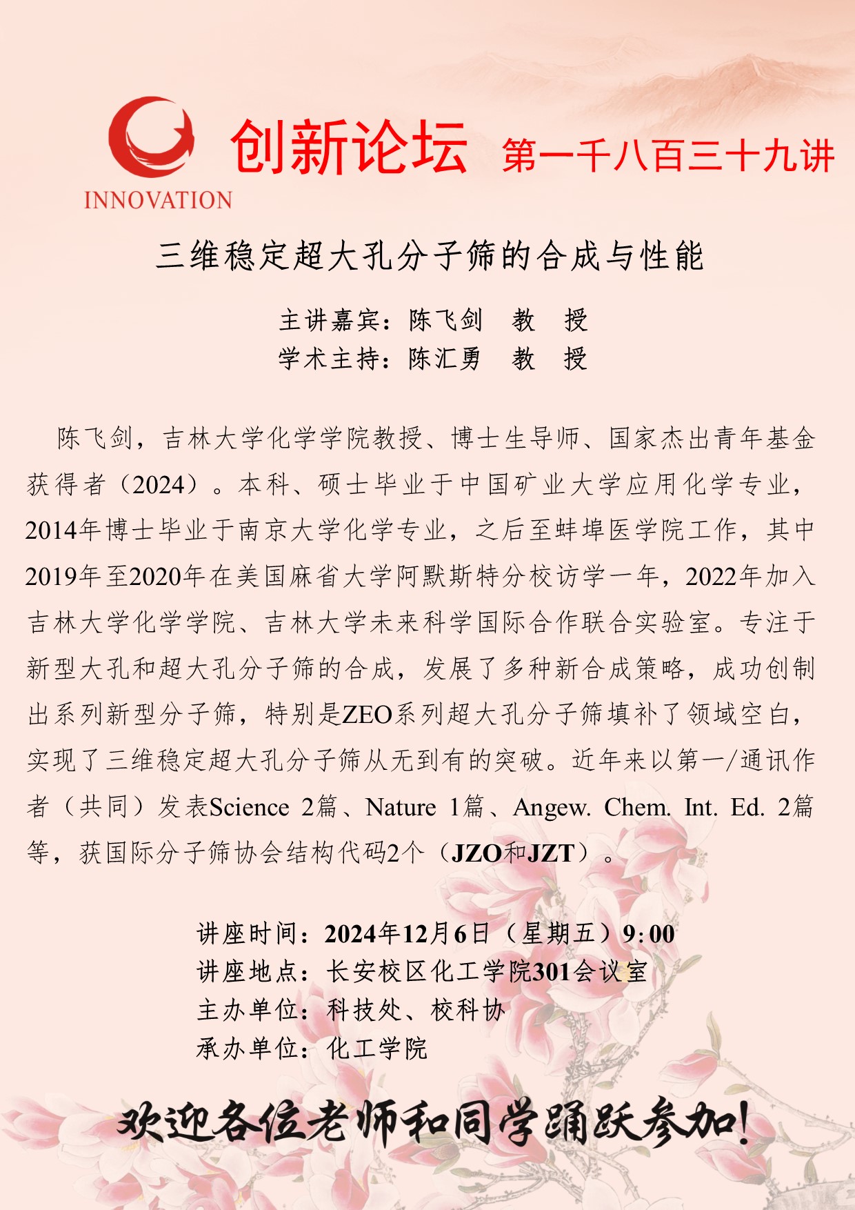 陈飞剑 教授 乐投平台创新论坛第一千八百三十九讲:三维稳定超大孔分子筛的合成与性能 讲座时间 2024年12月6日(星期五)9:00 讲座地点 长安校区化工学院301会议室 讲座人介绍 陈飞剑 教授 讲座内容 嗯