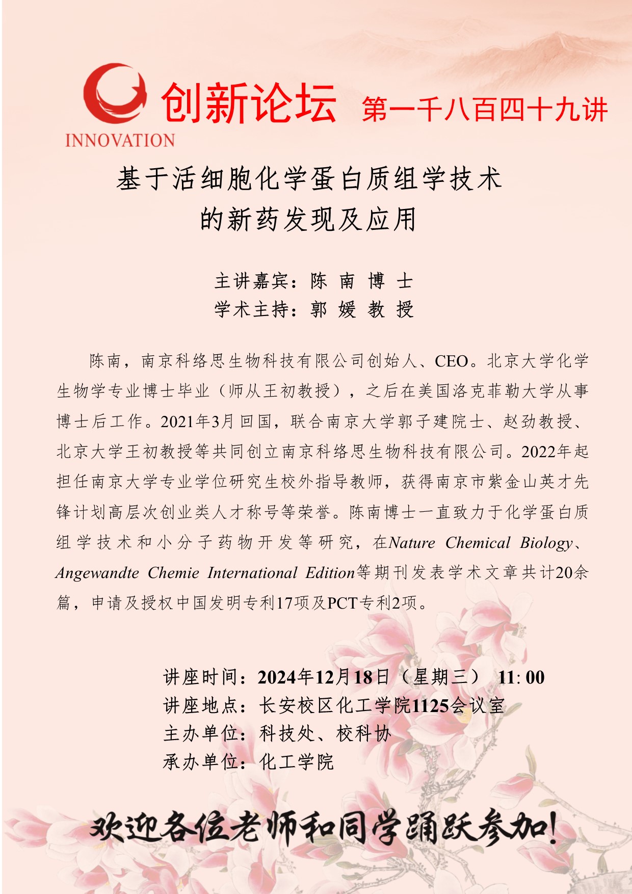 陈南 博士 乐投平台创新论坛第一千八百四十九讲:基于活细胞化学蛋白质组学技术的新药发现及应用 讲座时间 2024年12月18日(星期三)11: 00 讲座地点 长安校区化工学院1125会议室 讲座人介绍 陈南 博士 讲座内容