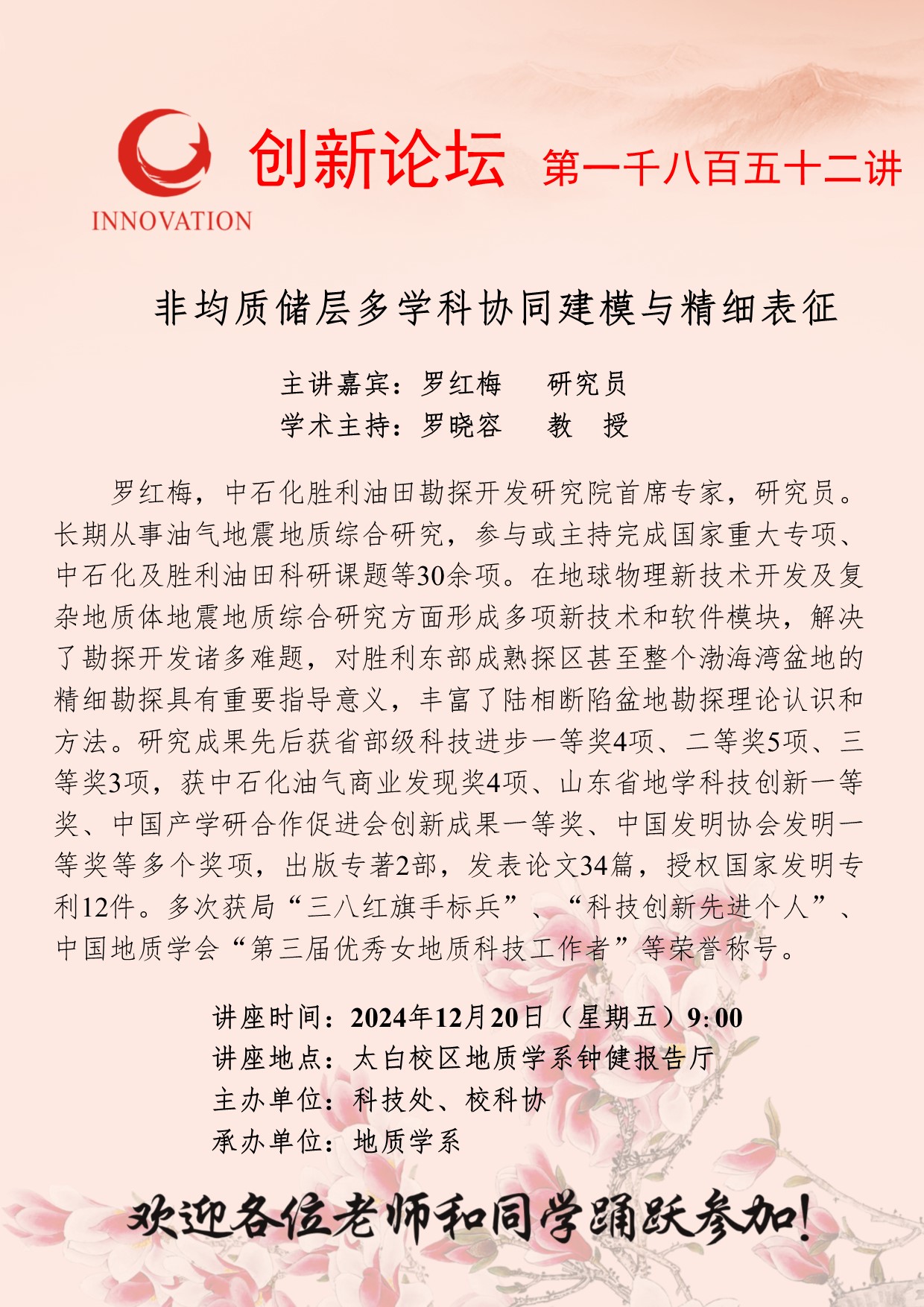 罗红梅 研究员 乐投平台创新论坛第一千八百五十二讲:非均质储层多学科协同建模与精细表征 讲座时间 2024年12月20日(星期五)9:00 讲座地点 太白校区地质学系钟健报告厅 讲座人介绍 罗红梅 研究员 讲座内容