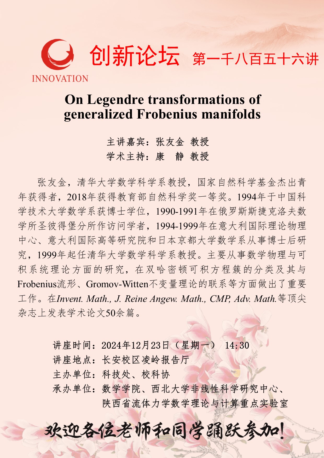 张友金 教授 乐投平台创新论坛第一千八百五十六讲:On Legendre transformations of generalized Frobenius manifolds 讲座时间 2024年12月23日(星期一) 14:30 讲座地点 长安校区凌岭报告厅 讲座人介绍 张友金 教授 讲座内容