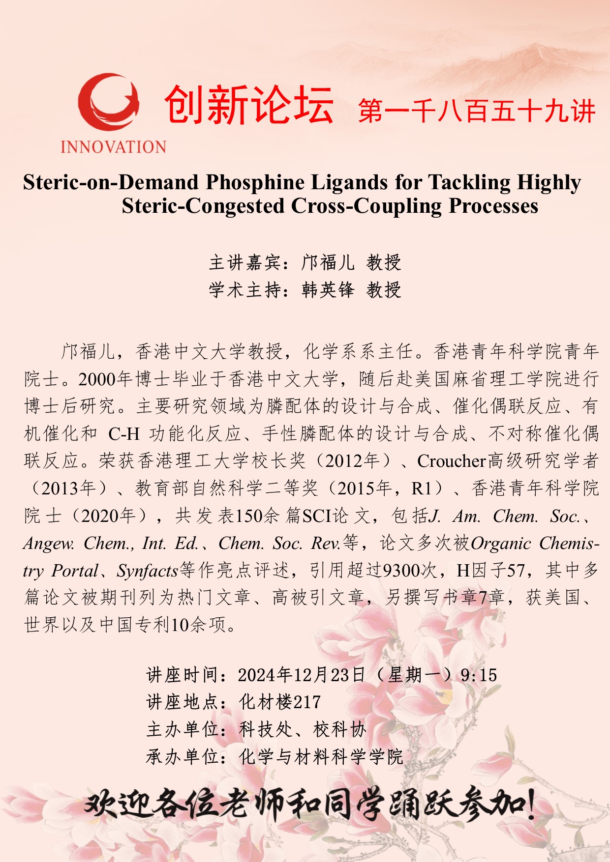 邝福儿 教授 乐投平台创新论坛第一千八百五十九讲:Steric-on-Demand Phosphine Ligands for Tackling Highly Steric-Congested Cross-Coupling Processes 讲座时间 2024年12月23日(星期一)9:15 讲座地点 化材楼217 讲座人介绍 邝福儿 教授 讲座内容