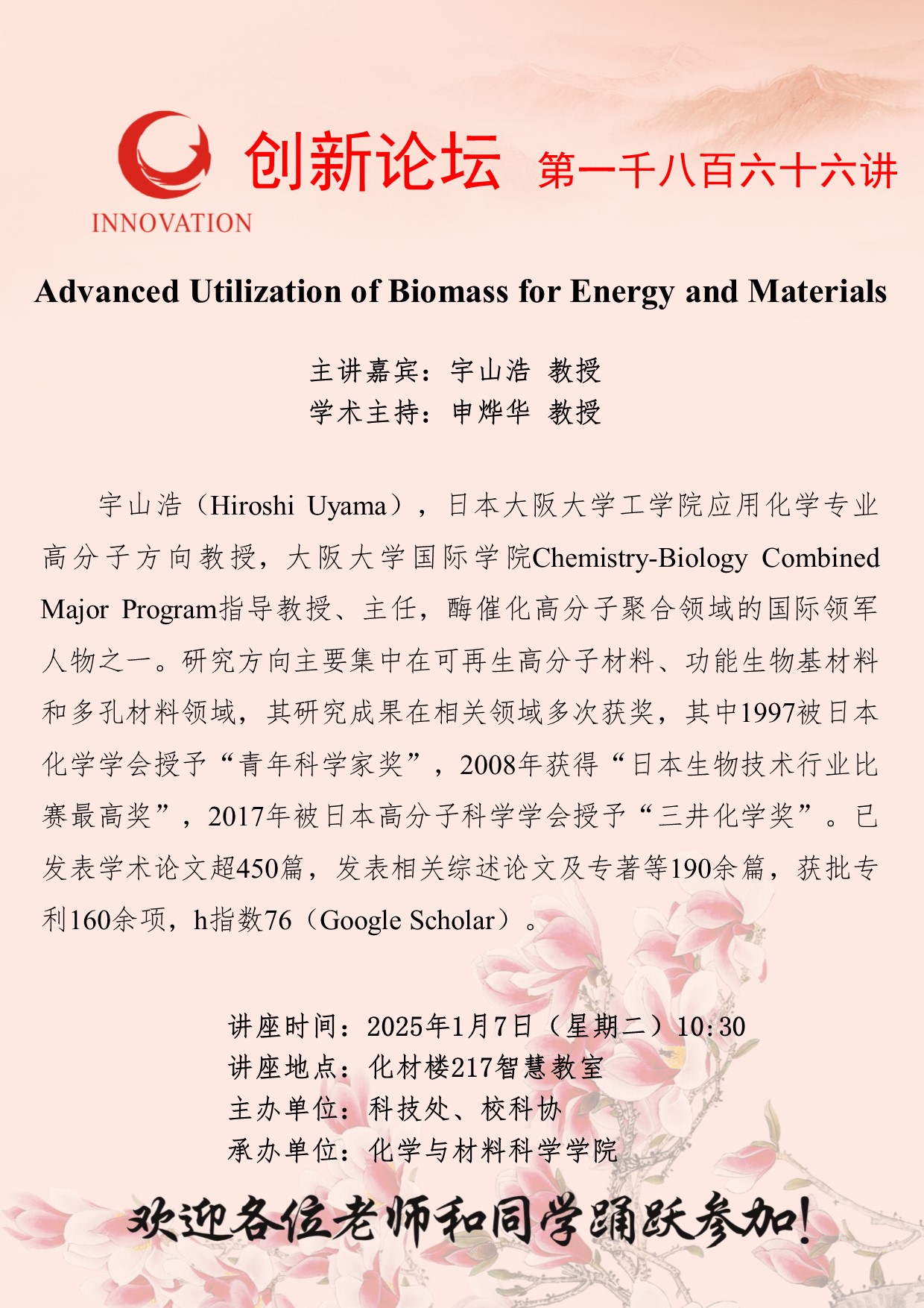 宇山浩 教授 乐投平台创新论坛第一千八百六十六讲:Advanced Utilization of Biomass for Energy and Materials 讲座时间 2025年1月7日(星期二)10:30 讲座地点 化材楼217智慧教室 讲座人介绍 宇山浩 教授 讲座内容