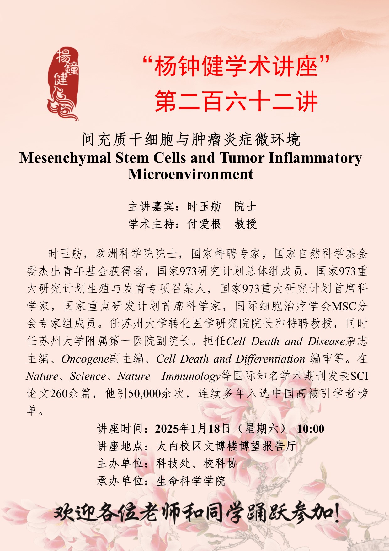 时玉舫 院士 “杨钟健学术讲座”第二百六十二讲:间充质干细胞与肿瘤炎症微环境(Mesenchymal Stem Cells and Tumor Inflammatory Microenvironment) 讲座时间 2025年1月18日(星期六) 10:00 讲座地点 太白校区文博楼博望报告厅 讲座人介绍 时玉舫 院士 讲座内容