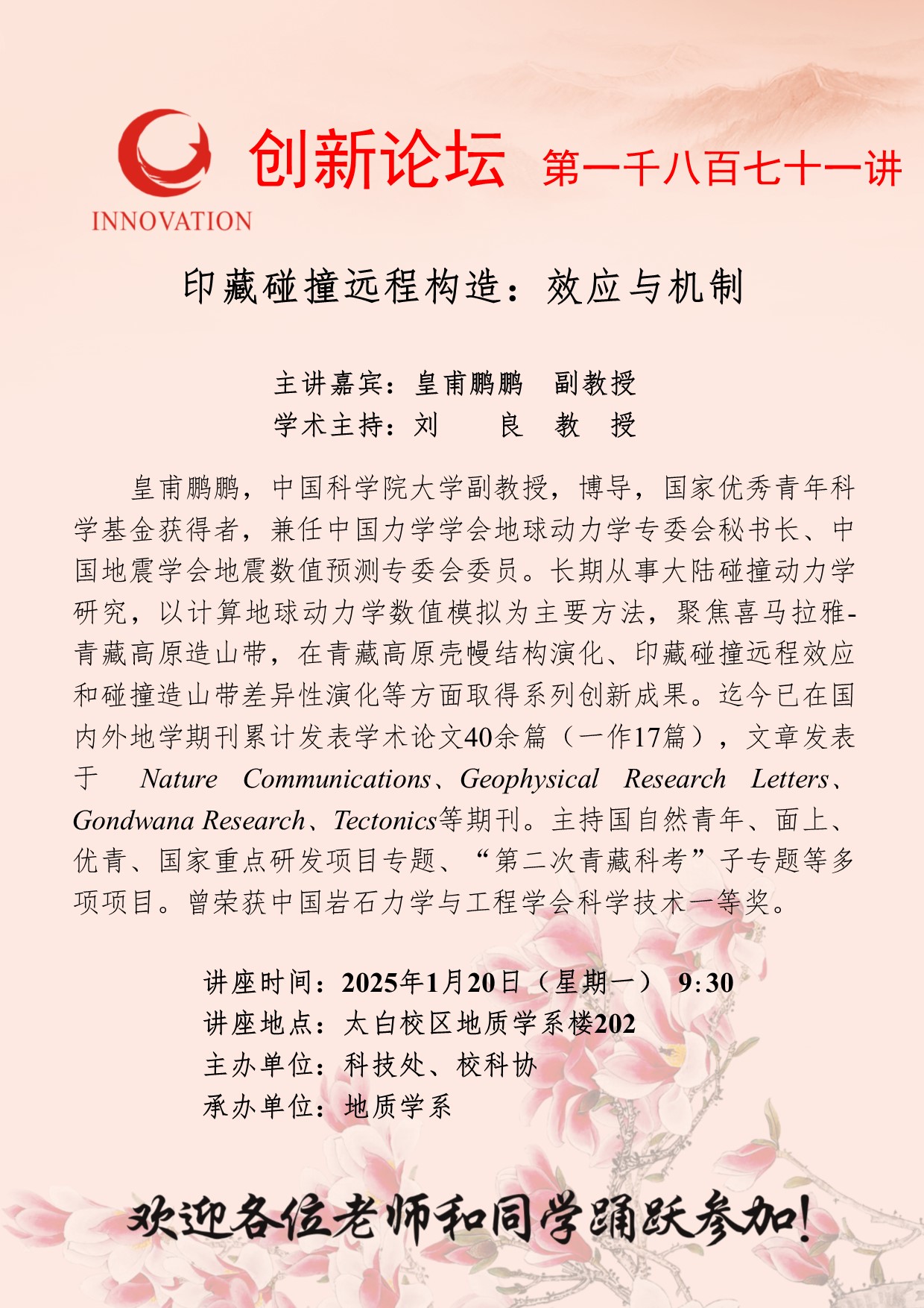 皇甫鹏鹏 副教授 乐投平台创新论坛第一千八百七十一讲:印藏碰撞远程构造:效应与机制 讲座时间 2025年1月20日(星期一) 9:30 讲座地点 太白校区地质学系楼202 讲座人介绍 皇甫鹏鹏 副教授 讲座内容
