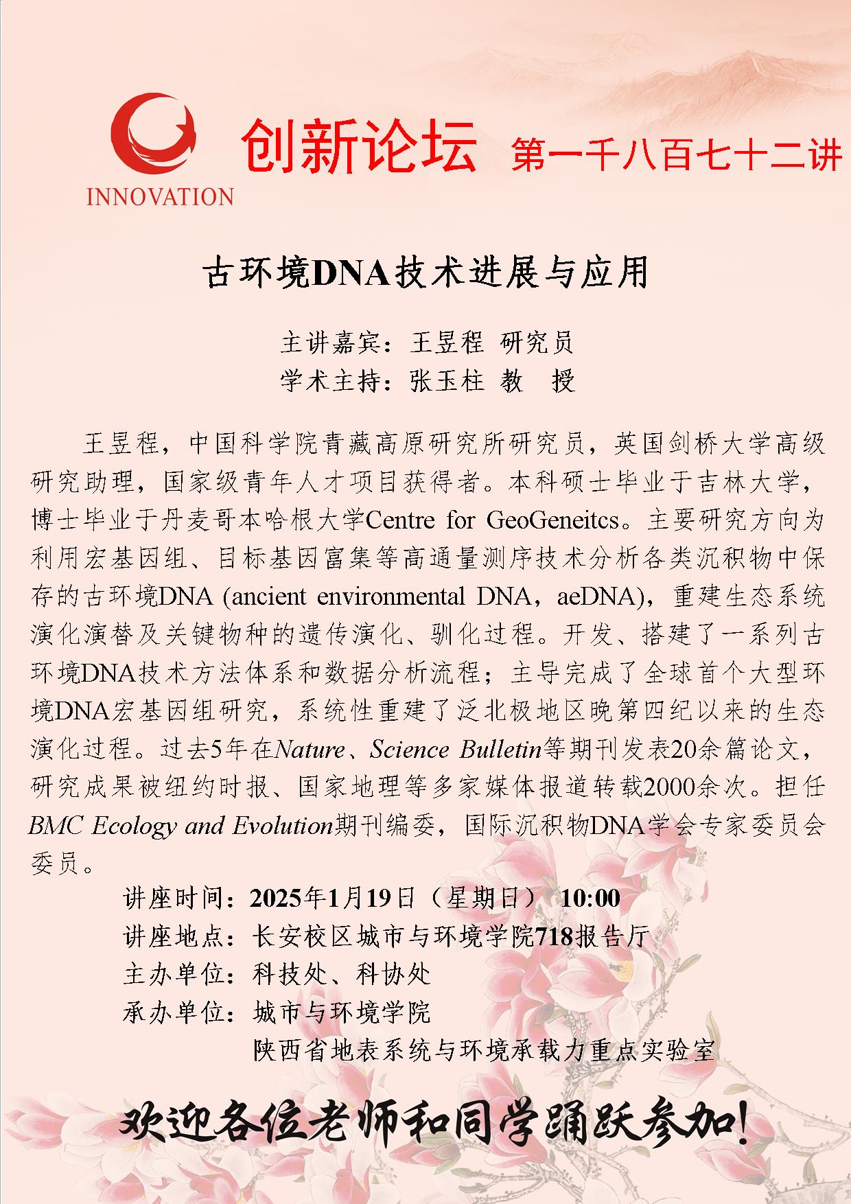 王昱程 研究员 乐投平台创新论坛第一千八百七十二讲:古环境DNA技术进展与应用 讲座时间 2025年1月19日(星期日) 10:00 讲座地点 长安校区城市与环境学院718报告厅 讲座人介绍 王昱程 研究员 讲座内容