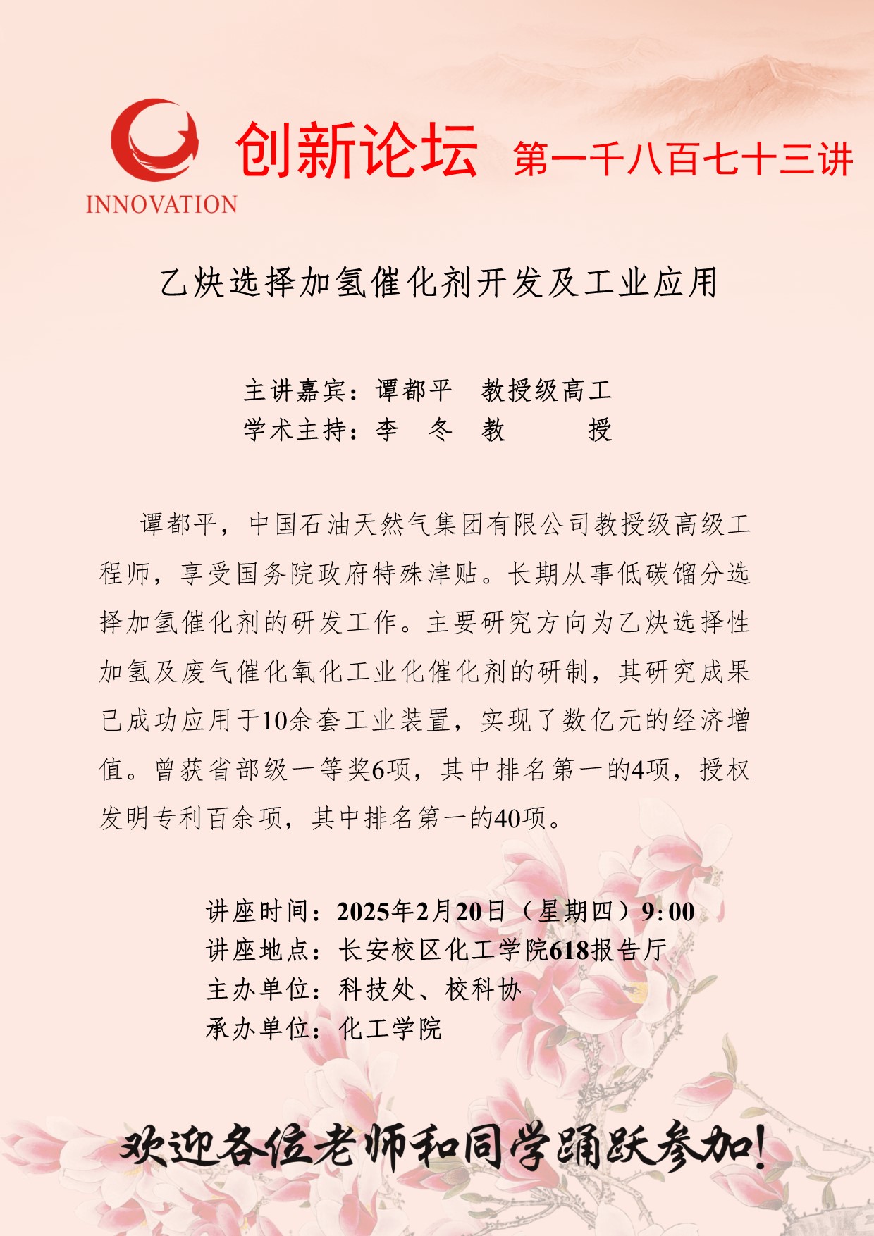 谭都平 教授级高工 乐投平台创新论坛第一千八百七十三讲:乙炔选择加氢催化剂开发及工业应用 讲座时间 2025年2月20日(星期四)9:00 讲座地点 长安校区化工学院618报告厅 讲座人介绍 谭都平 教授级高工 讲座内容