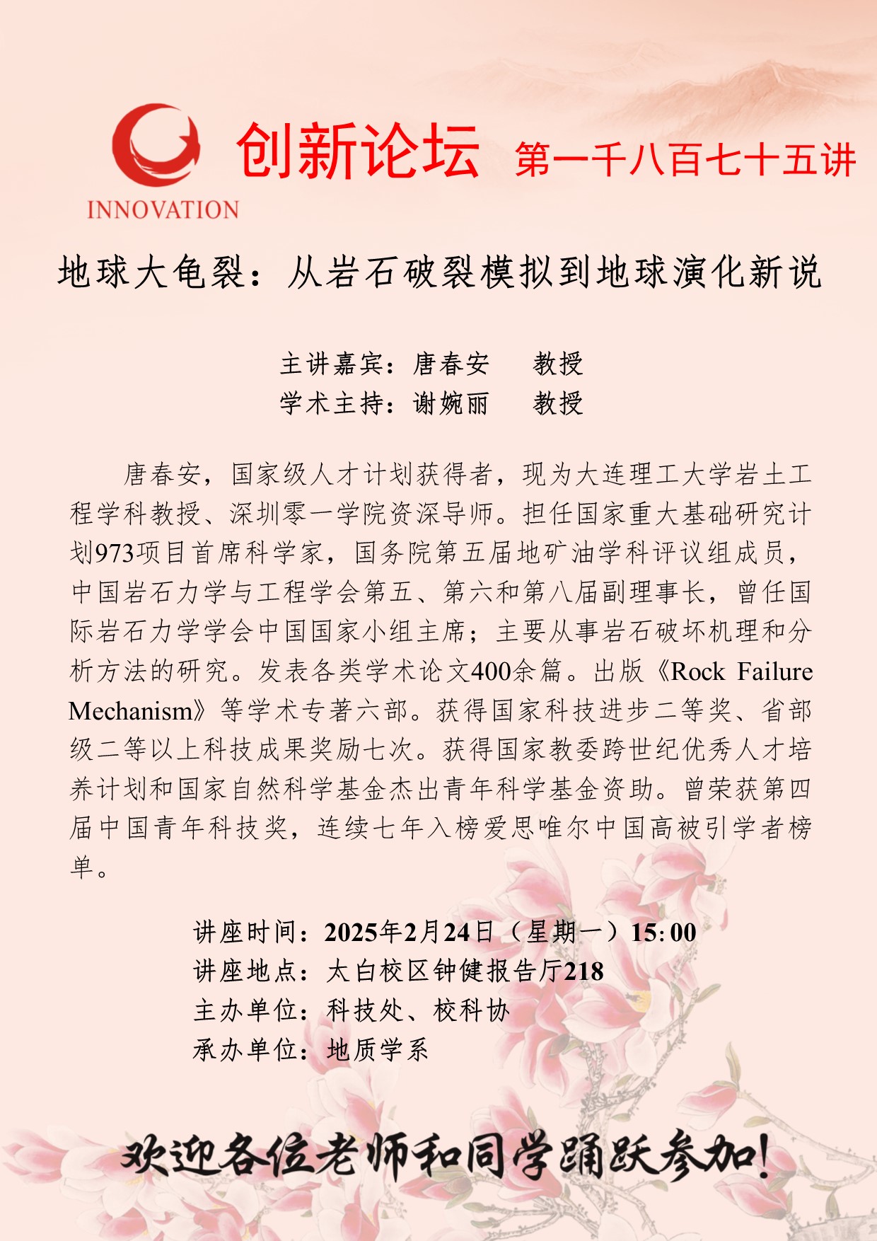 唐春安 教授 乐投平台创新论坛第一千八百七十五讲:地球大龟裂:从岩石破裂模拟到地球演化新说 讲座时间 2025年2月24日(星期一)15:00 讲座地点 太白校区钟健报告厅218 讲座人介绍 唐春安 教授 讲座内容