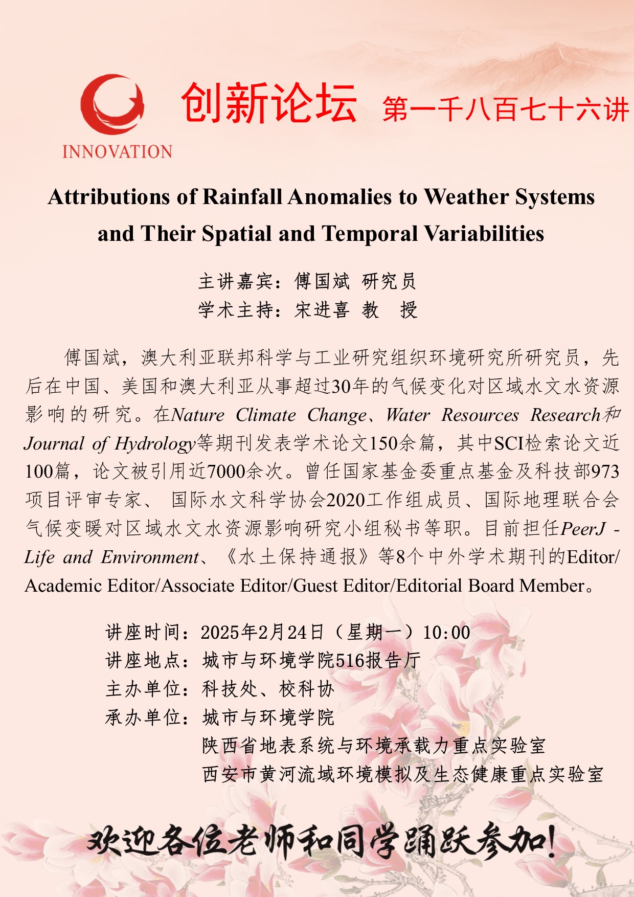 傅国斌 研究员 乐投平台创新论坛第一千八百七十六讲:Attributions of Rainfall Anomalies to Weather Systems and Their Spatial and Temporal Variabilities 讲座时间 2025年2月24日(星期一)10:00 讲座地点 城市与环境学院516报告厅 讲座人介绍 傅国斌 研究员 讲座内容