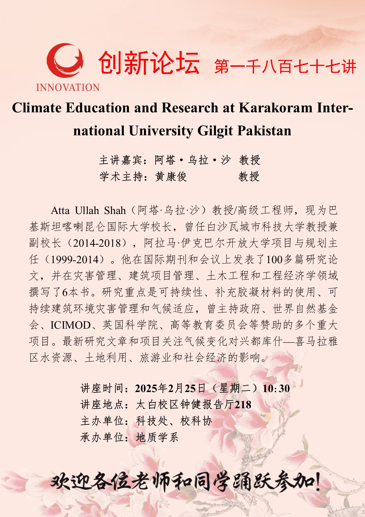 阿塔·乌拉·沙 教授 乐投平台创新论坛第一千八百七十七讲:Climate Education and Research at Karakoram International University Gilgit Pakistan 讲座时间 2025年2月25日(星期二)10:30 讲座地点 太白校区钟健报告厅218 讲座人介绍 阿塔·乌拉·沙 教授 讲座内容