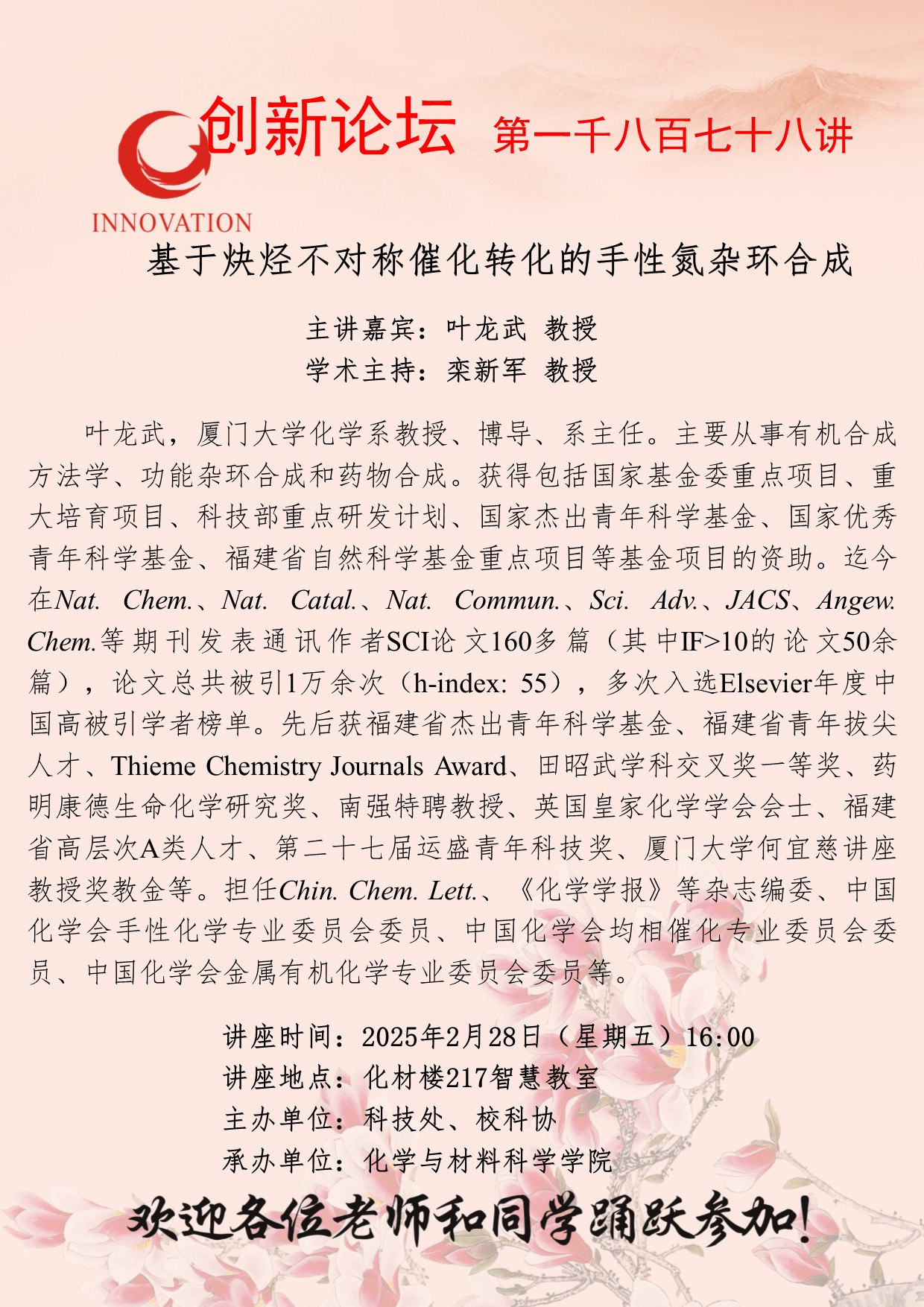 叶龙武 教授 乐投平台创新论坛第一千八百七十八讲:基于炔烃不对称催化转化的手性氮杂环合成 讲座时间 2025年2月28日(星期五)16:00 讲座地点 化材楼217智慧教室 讲座人介绍 叶龙武 教授 讲座内容