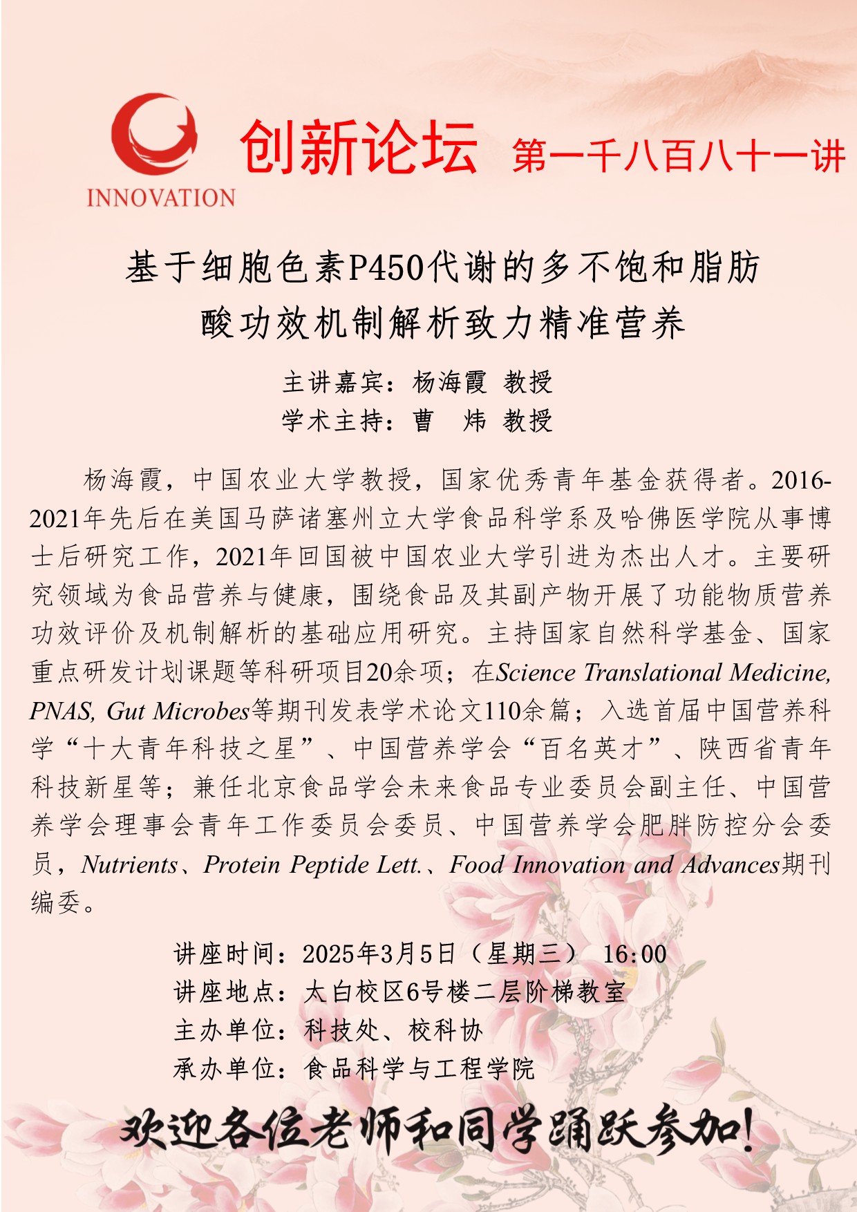 杨海霞 教授 乐投平台创新论坛第一千八百八十一讲:基于细胞色素P450代谢的多不饱和脂肪酸功效机制解析致力精准营养 讲座时间 2025年3月5日(星期三)16:00 讲座地点 太白校区6号楼二层阶梯教室 讲座人介绍 杨海霞 教授 讲座内容