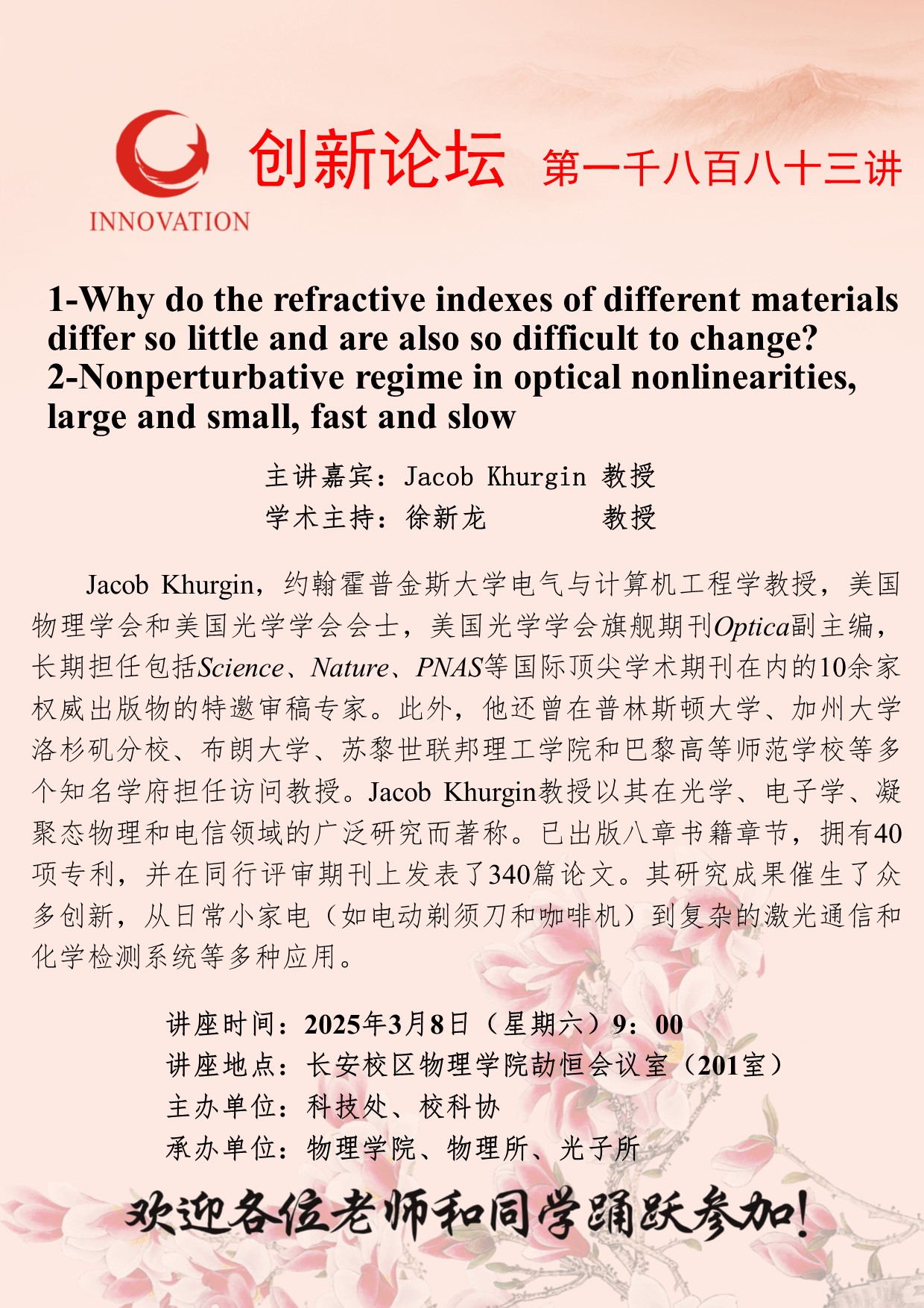 Jacob Khurgin 教授 乐投平台创新论坛第一千八百八十三讲:1-Why do the refractive indexes of different materials differ so little and are also so difficult to change? 讲座时间 2025年3月8日(星期六)9:00 讲座地点 长安校区物理学院劼恒会议室(201室) 讲座人介绍 Jacob Khurgin 教授 讲座内容