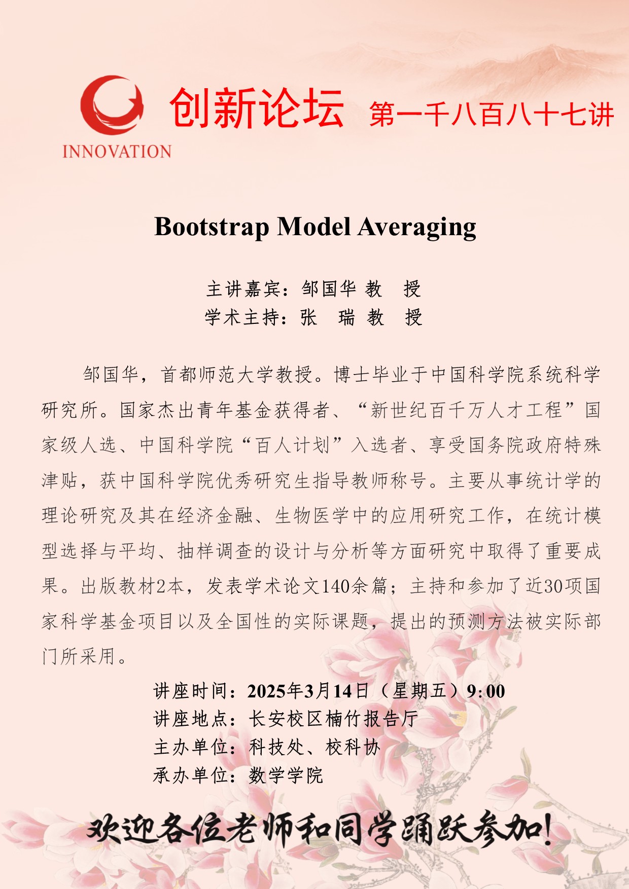 邹国华 教授 乐投平台创新论坛第一千八百八十七讲:Bootstrap Model Averaging 讲座时间 2025年3月14日(星期五)9:00 讲座地点 长安校区楠竹报告厅 讲座人介绍 邹国华 教授 讲座内容