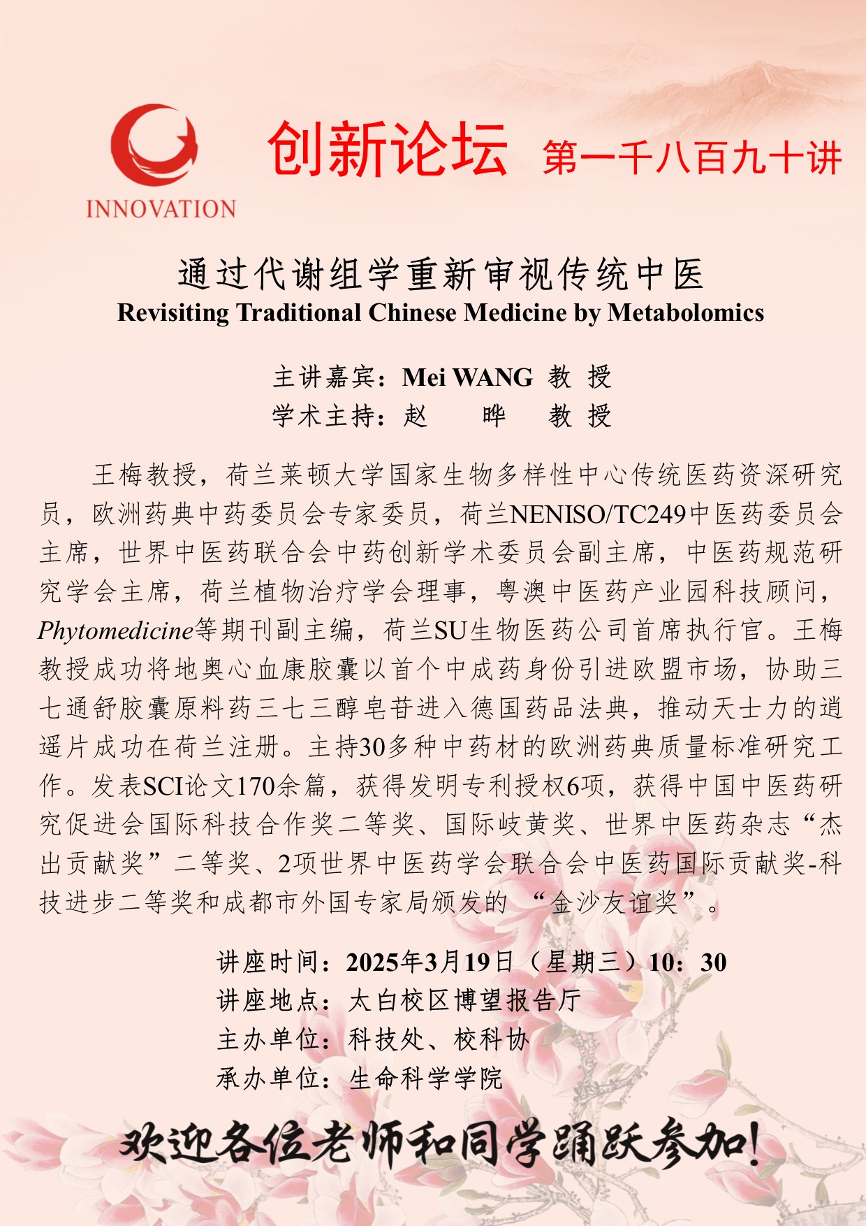 Mei WANG 教授 乐投平台创新论坛第一千八百九十讲:通过代谢组学重新审视传统中医Revisiting Traditional Chinese Medicine by Metabolomics 讲座时间 2025年3月19日(星期三)10:30 讲座地点 太白校区博望报告厅 讲座人介绍 Mei WANG 教授 讲座内容