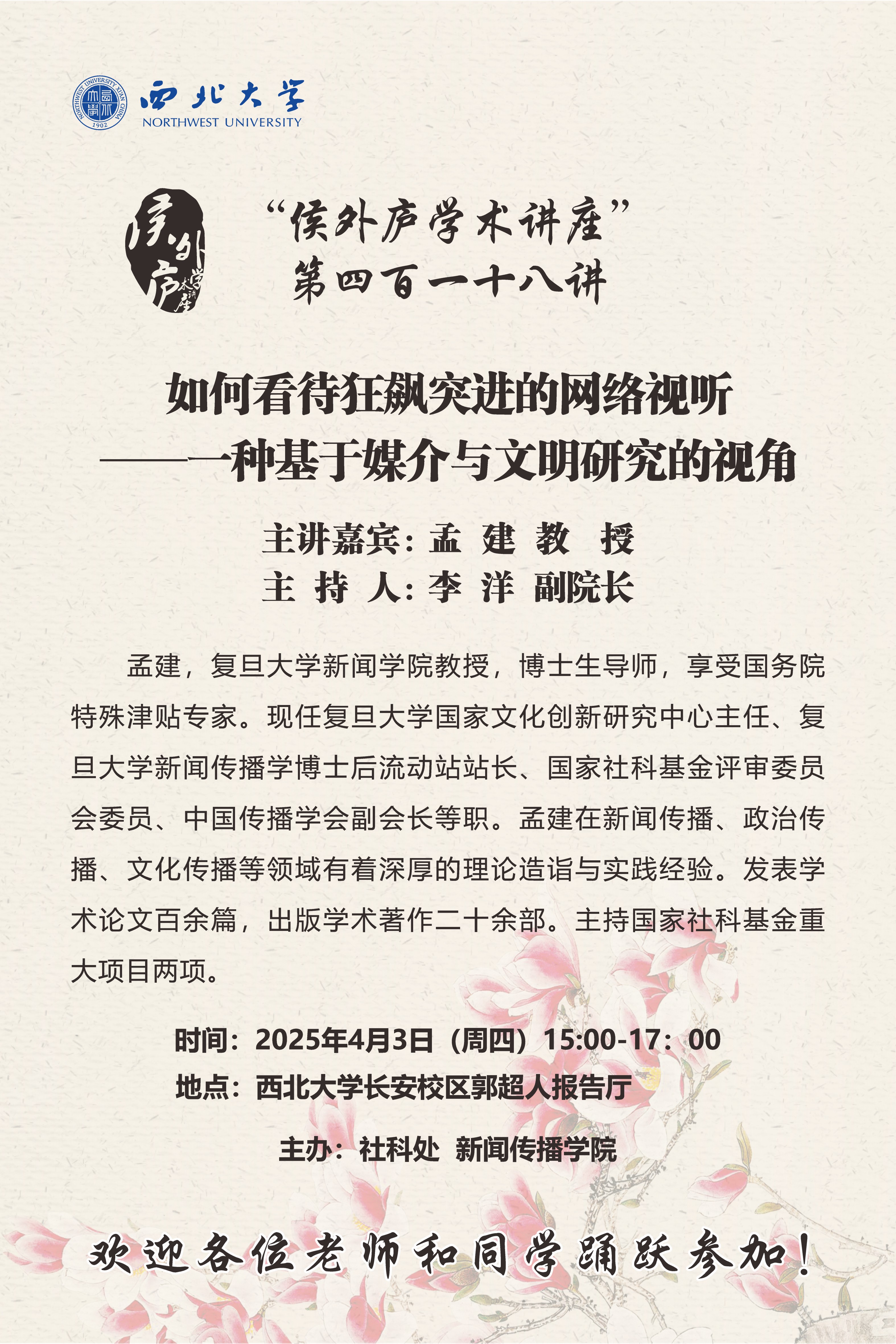 孟建 教授 “侯外庐学术讲座”第四百一十八讲:如何看待狂飙突进的网络视听——一种基于媒介与文明研究的视角 讲座时间 2025年4月3日(周四)15:00-17:00 讲座地点 乐投平台长安校区郭超人报告厅 讲座人介绍 孟建 教授 讲座内容