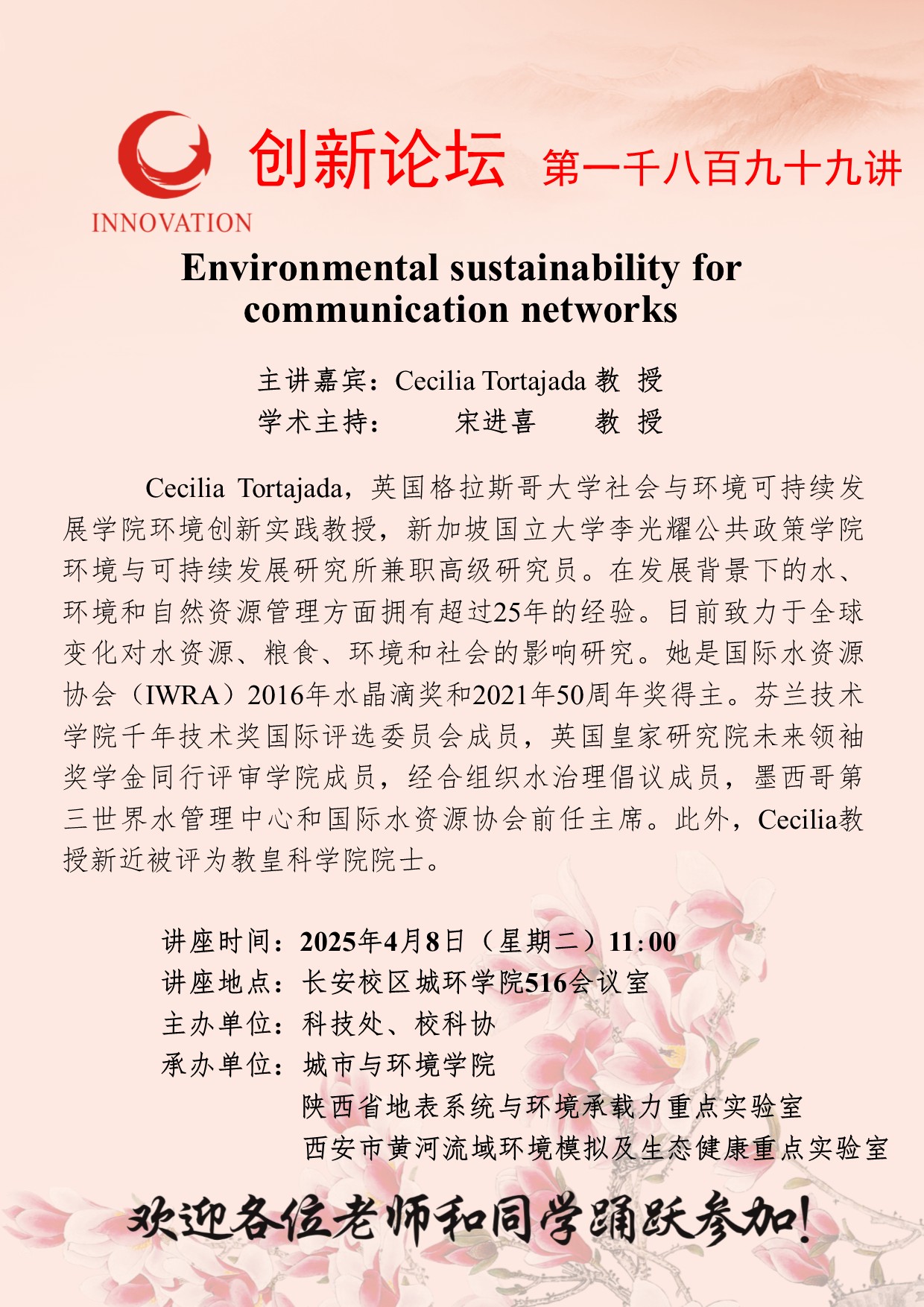 Cecilia Tortajada 教授 乐投平台创新论坛第一千八百九十九讲:Environmental sustainability for communication networks 讲座时间 2025年4月8日(星期二)11:00 讲座地点 长安校区城环学院516会议室 讲座人介绍 Cecilia Tortajada 教授 讲座内容