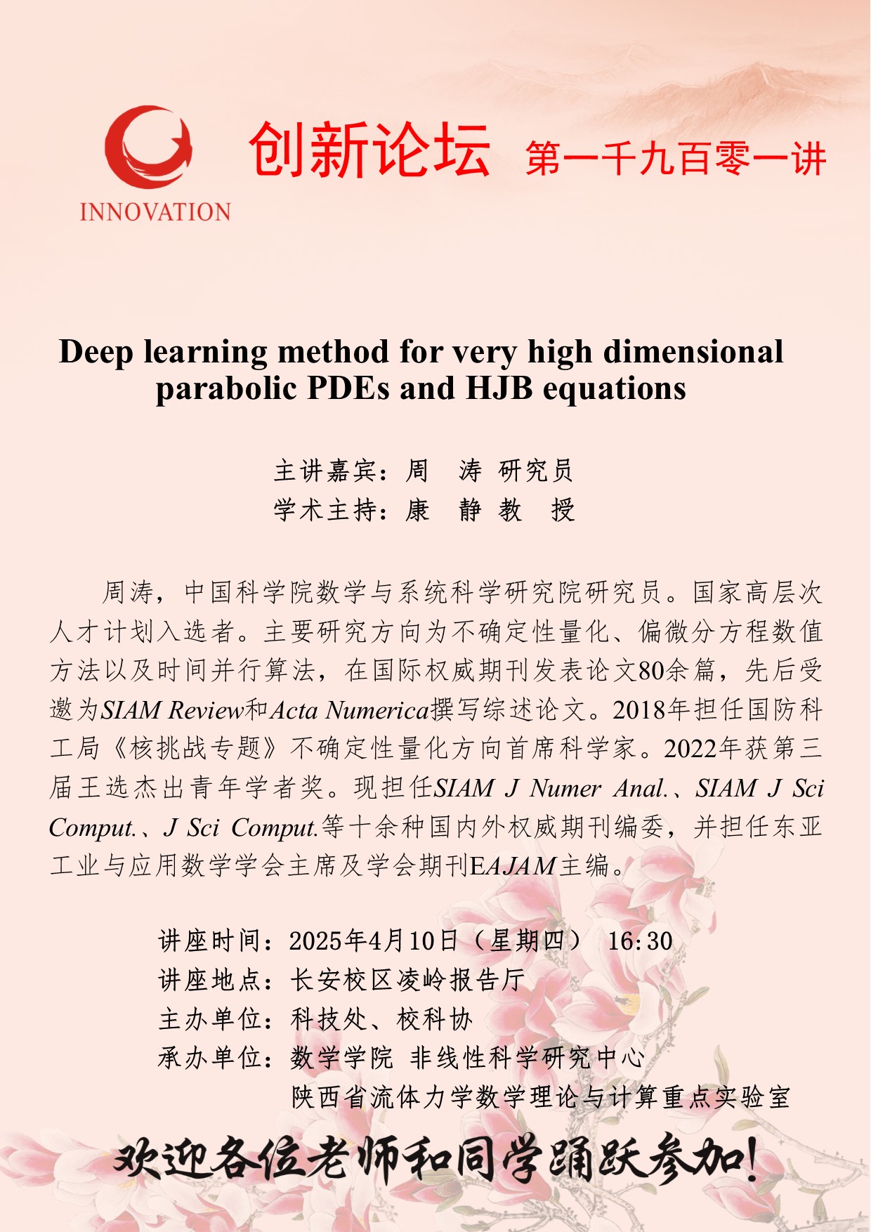 周涛 研究员 乐投平台创新论坛第一千九百零一讲:Deep learning method for very high dimensional parabolic PDEs and HJB equations 讲座时间 2025年4月10日(星期四) 16:30 讲座地点 长安校区凌岭报告厅 讲座人介绍 周涛 研究员 讲座内容