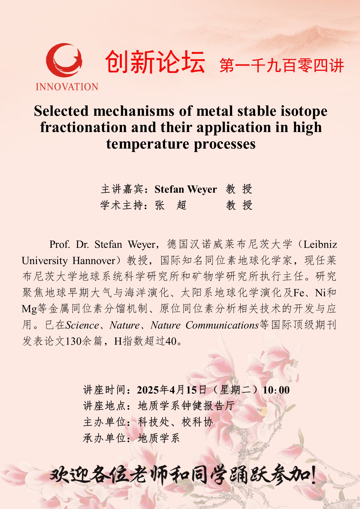 Stefan Weyer 教授 乐投平台创新论坛第一千九百零四讲:Selected mechanisms of metal stable isotope fractionation and their application in high temperature processes 讲座时间 2025年4月15日(星期二)10:00 讲座地点 地质学系钟健报告厅 讲座人介绍 Stefan Weyer 教授 讲座内容