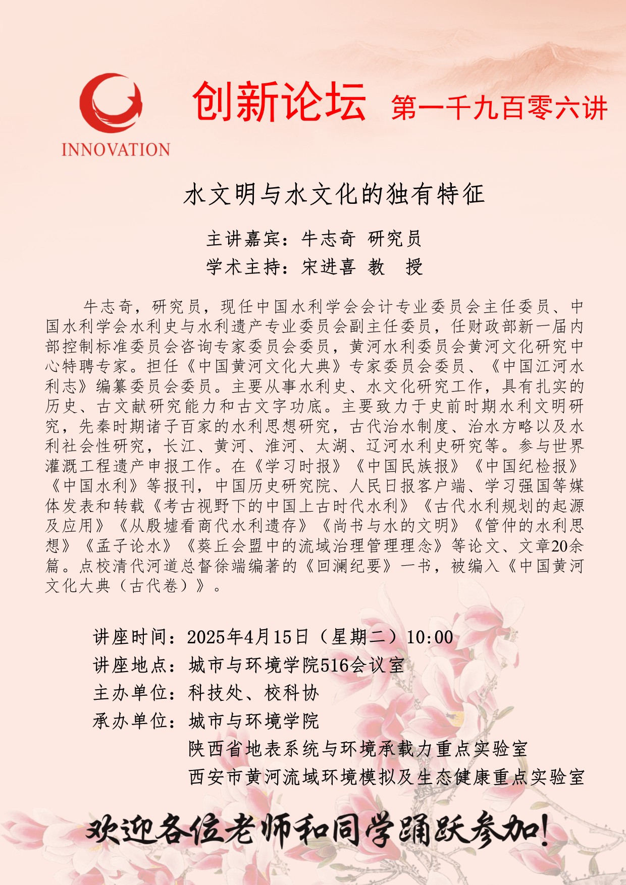 牛志奇 研究员 乐投平台创新论坛第一千九百零六讲:水文明与水文化的独有特征 讲座时间 2025年4月15日(星期二)10:00 讲座地点 城市与环境学院516会议室 讲座人介绍 牛志奇 研究员 讲座内容
