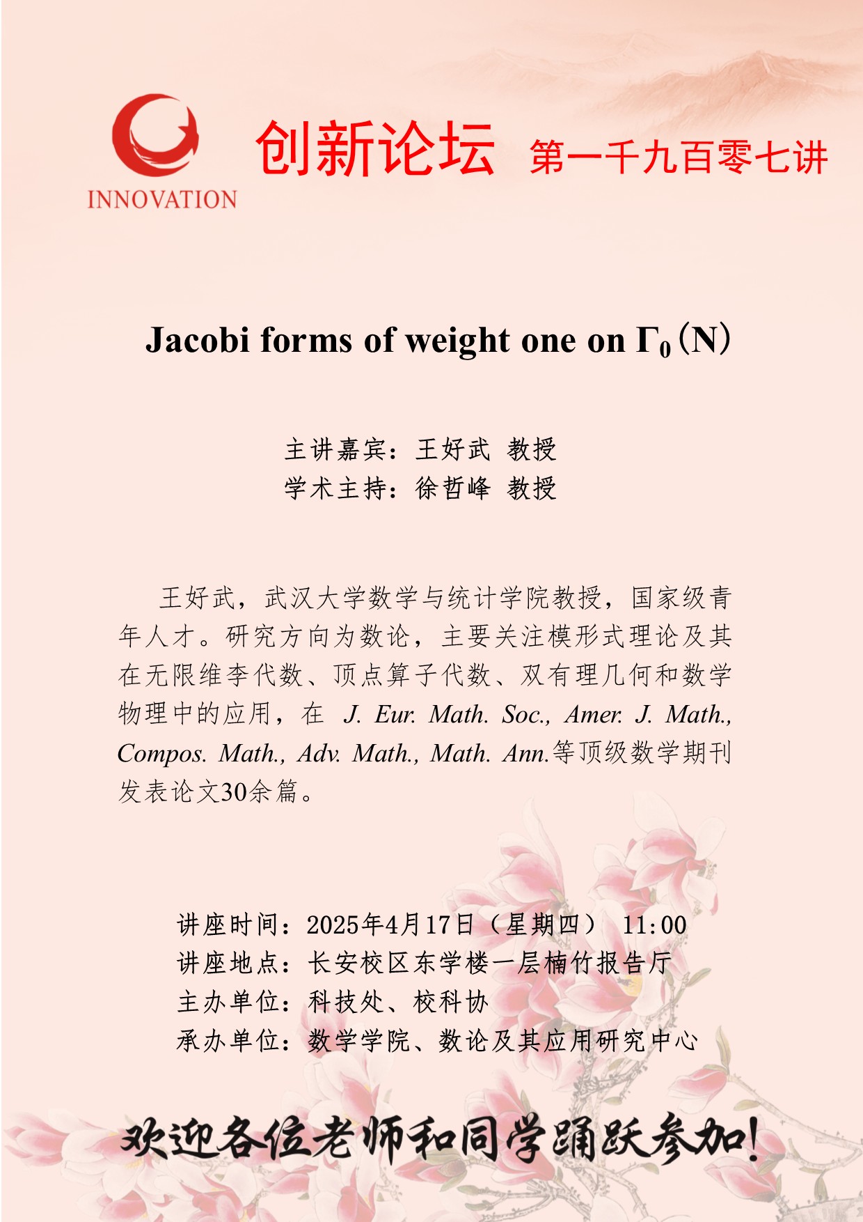 王好武 教授 乐投平台创新论坛第一千九百零七讲:Jacobi forms of weight one on Γ0(N) 讲座时间 2025年4月17日(星期四) 11:00 讲座地点 长安校区东学楼一层楠竹报告厅 讲座人介绍 王好武 教授 讲座内容