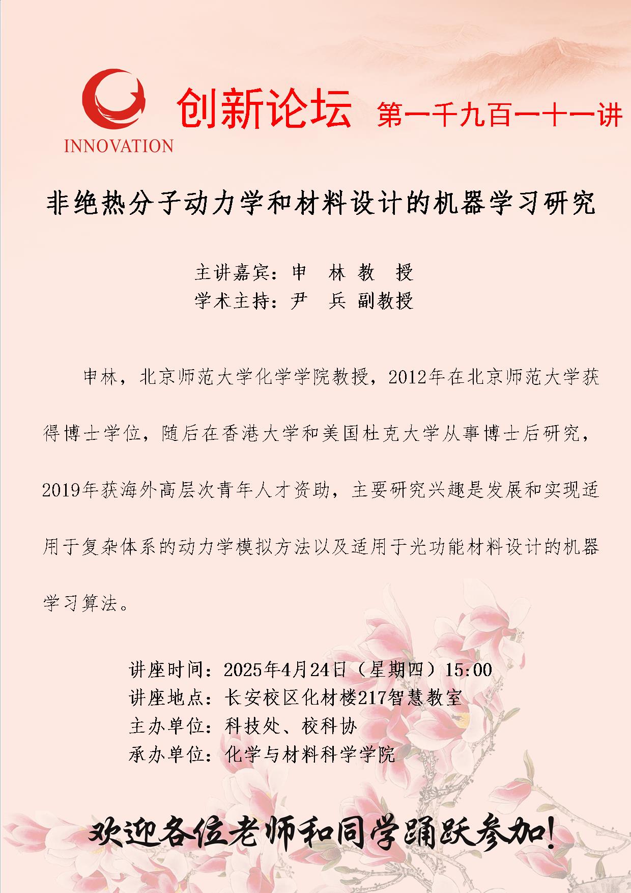 申林 教授 乐投平台创新论坛第一千九百一十一讲:非绝热分子动力学和材料设计的机器学习研究 讲座时间 2025年4月24日(星期四)15:00 讲座地点 长安校区化材楼217智慧教室 讲座人介绍 申林 教授 讲座内容