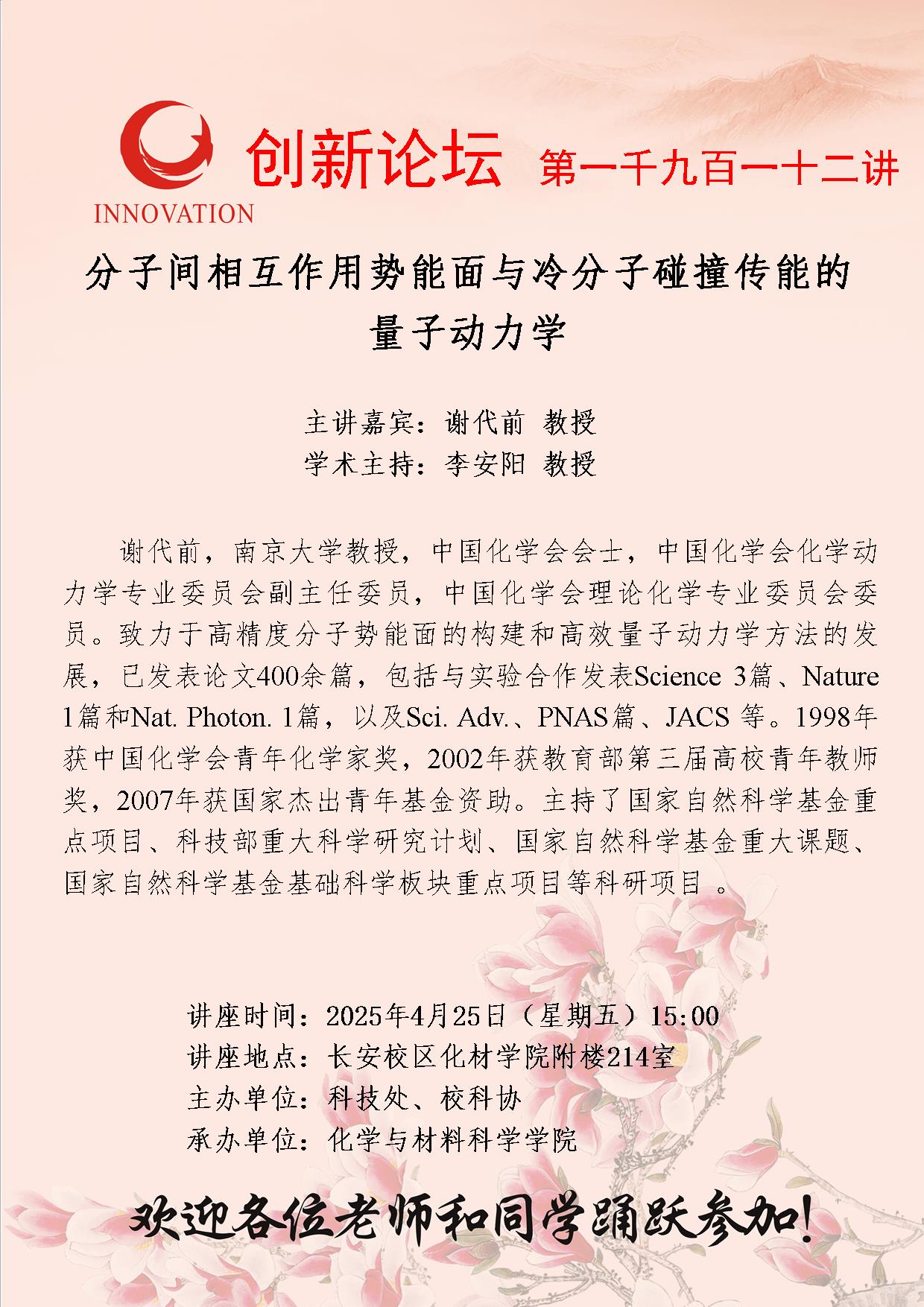 谢代前 教授 乐投平台创新论坛第一千九百一十二讲:分子间相互作用势能面与冷分子碰撞传能的量子动力学 讲座时间 2025年4月25日(星期五)15:00 讲座地点 长安校区化材学院附楼214室 讲座人介绍 谢代前 教授 讲座内容