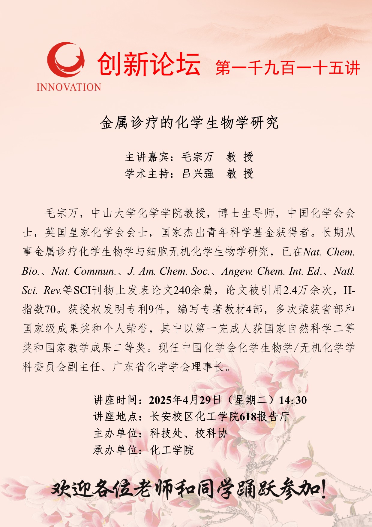 毛宗万 教授 乐投平台创新论坛第一千九百一十五讲:金属诊疗的化学生物学研究 讲座时间 2025年4月29日(星期二)14:30 讲座地点 长安校区化工学院618报告厅 讲座人介绍 毛宗万 教授 讲座内容