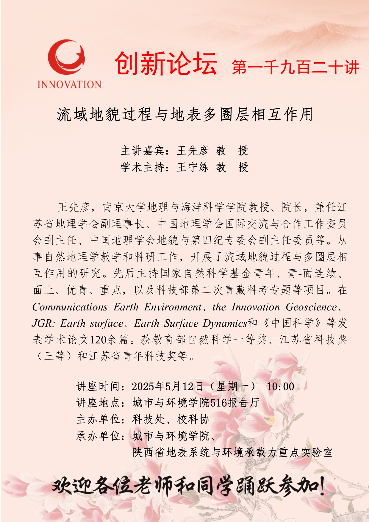 王先彦 教授 乐投平台创新论坛第一千九百二十讲:流域地貌过程与地表多圈层相互作用 讲座时间 2025年5月12日(星期一) 10:00 讲座地点 城市与环境学院516报告厅 讲座人介绍 王先彦 教授 讲座内容