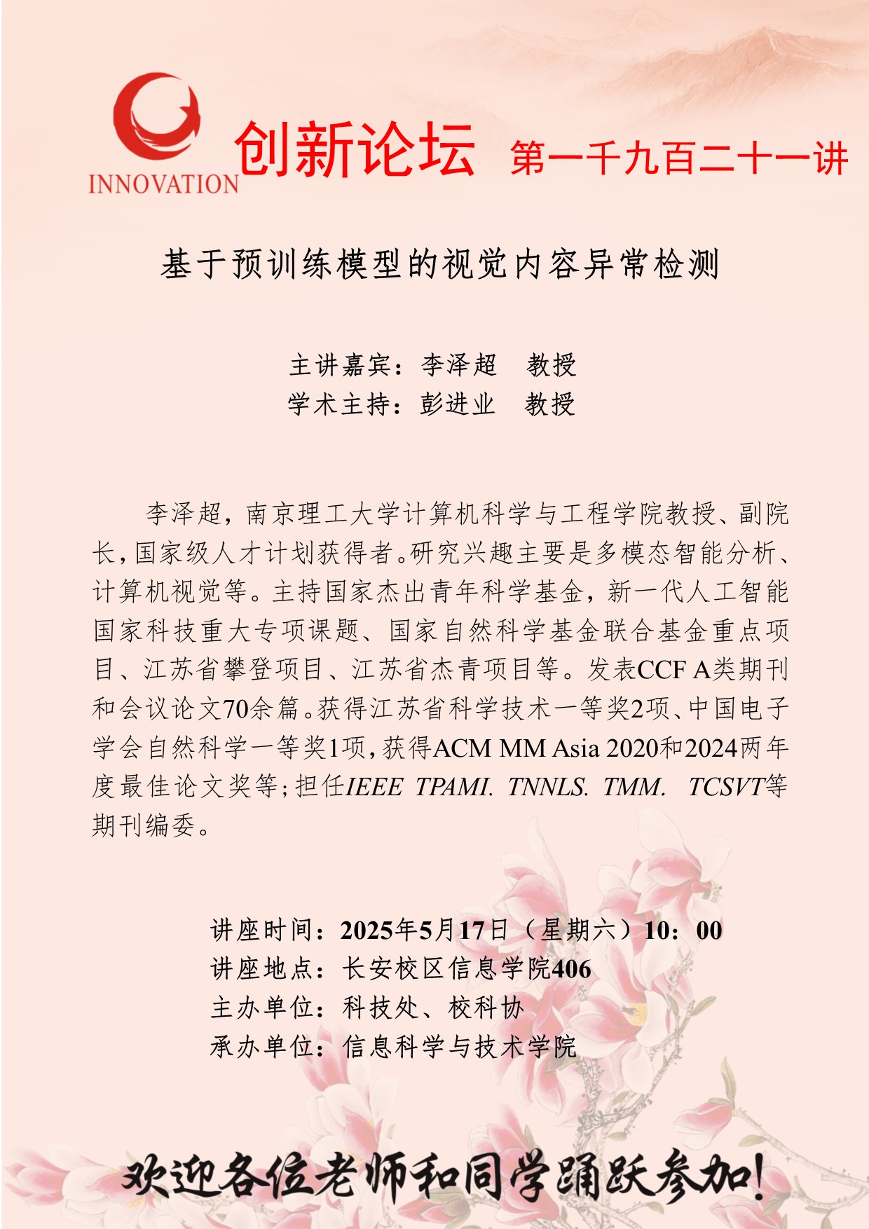 李泽超 教授 乐投平台创新论坛第一千九百二十一讲:基于预训练模型的视觉内容异常检测 讲座时间 2025年5月17日(星期六)10:00 讲座地点 长安校区信息学院406 讲座人介绍 李泽超 教授 讲座内容
