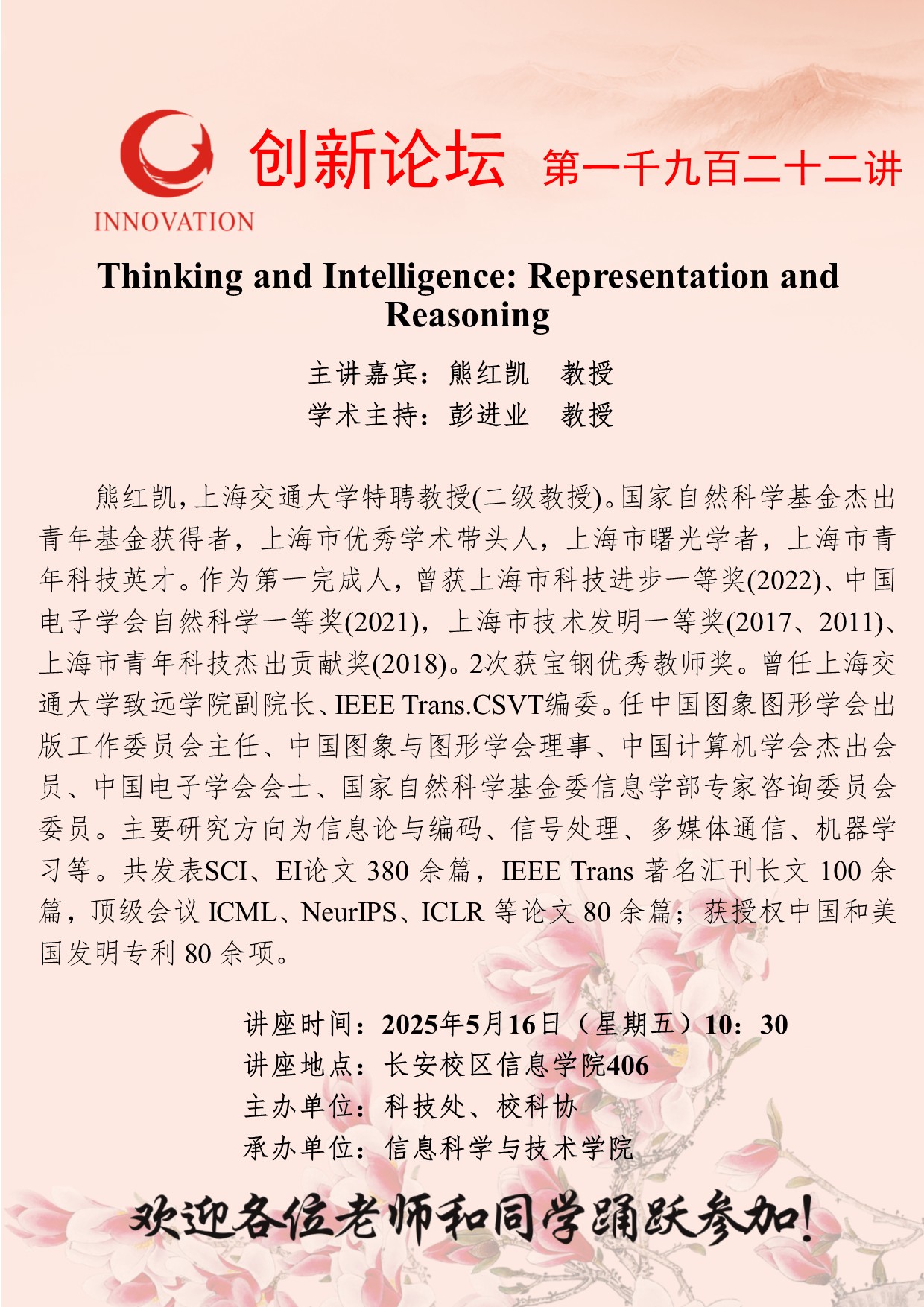 熊红凯 教授 乐投平台创新论坛第一千九百二十二讲:Thinking and Intelligence: Representation and Reasoning 讲座时间 2025年5月16日(星期五)10:30 讲座地点 长安校区信息学院406 讲座人介绍 熊红凯 教授 讲座内容