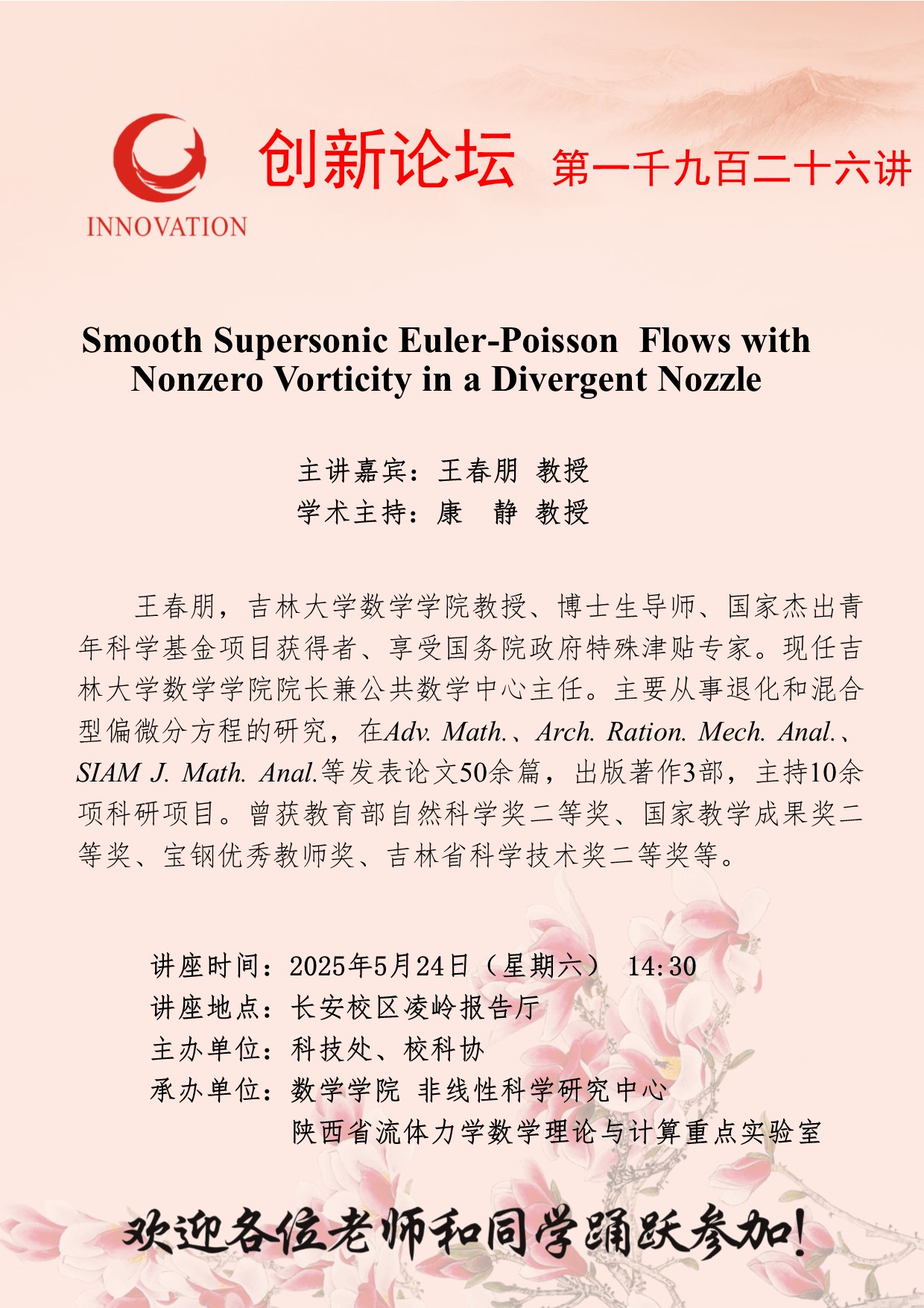 王春朋 教授 乐投平台创新论坛第一千九百二十六讲:Smooth Supersonic Euler-Poisson Flows with Nonzero Vorticity in a Divergent Nozzle 讲座时间 2025年5月24日(星期六) 14:30 讲座地点 长安校区凌岭报告厅 讲座人介绍 王春朋 教授 讲座内容