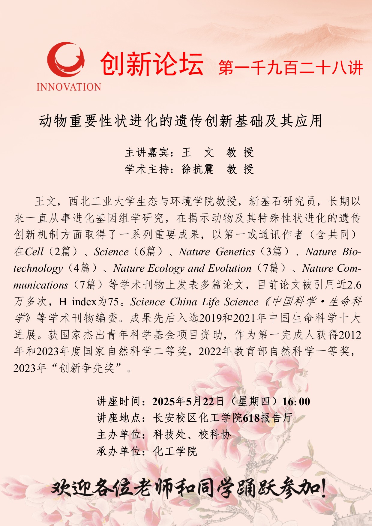 王文 教授 乐投平台创新论坛第一千九百二十八讲:动物重要性状进化的遗传创新基础及其应用 讲座时间 2025年5月22日(星期四)16:00 讲座地点 长安校区化工学院618报告厅 讲座人介绍 王文 教授 讲座内容